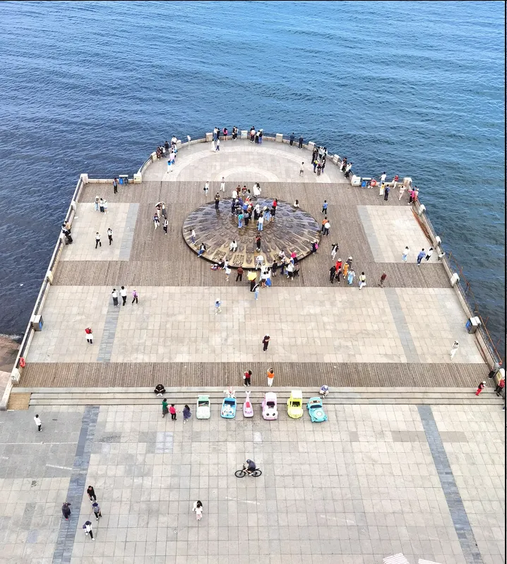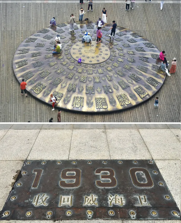 “万福图”,它直径13.8米、高1.38米。表面有五圈共100个真、草、隶、篆四体镌刻的“福”字,寓意五福临门、五福同享;中心是抽象的威海地图,标注经纬度与通往世界名城的距离标识,是“千里幸福海岸线”的标志性景观。
