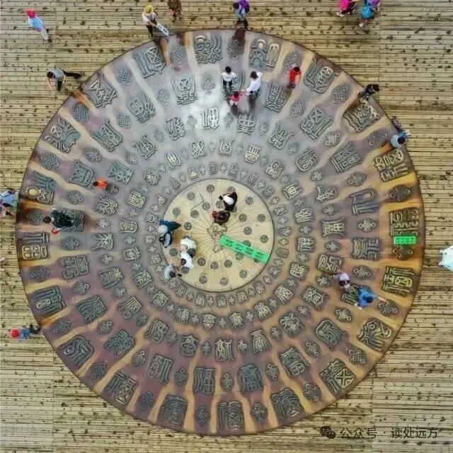幸福门,寓意着开启幸福之门。门前的“万福图”是圆形锻铜雕塑,高1.38米、直径13.8米,表面排列着五圈共100个不同字体的“福”字,寓意“五福临门”“五福同享”,吸引了无数游客在此踩福祈福,寄托对美好生活的向往。