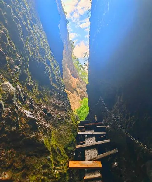 这条裂谷藏在大别山里,全长差不多五公里,最窄的地方两个人侧身都费劲,最宽的地方也就十来米,关键是它不是平着走的,是一路往下走的,你沿着栈道往谷底走,光线越来越暗,温度越来越低,空气里全是那种潮湿的石头味儿,等你走到谷底,抬头一看,天空就剩一条缝了,那一瞬间你会有种错觉,觉得自己不是在地表上玩,是钻进地球内部去了。