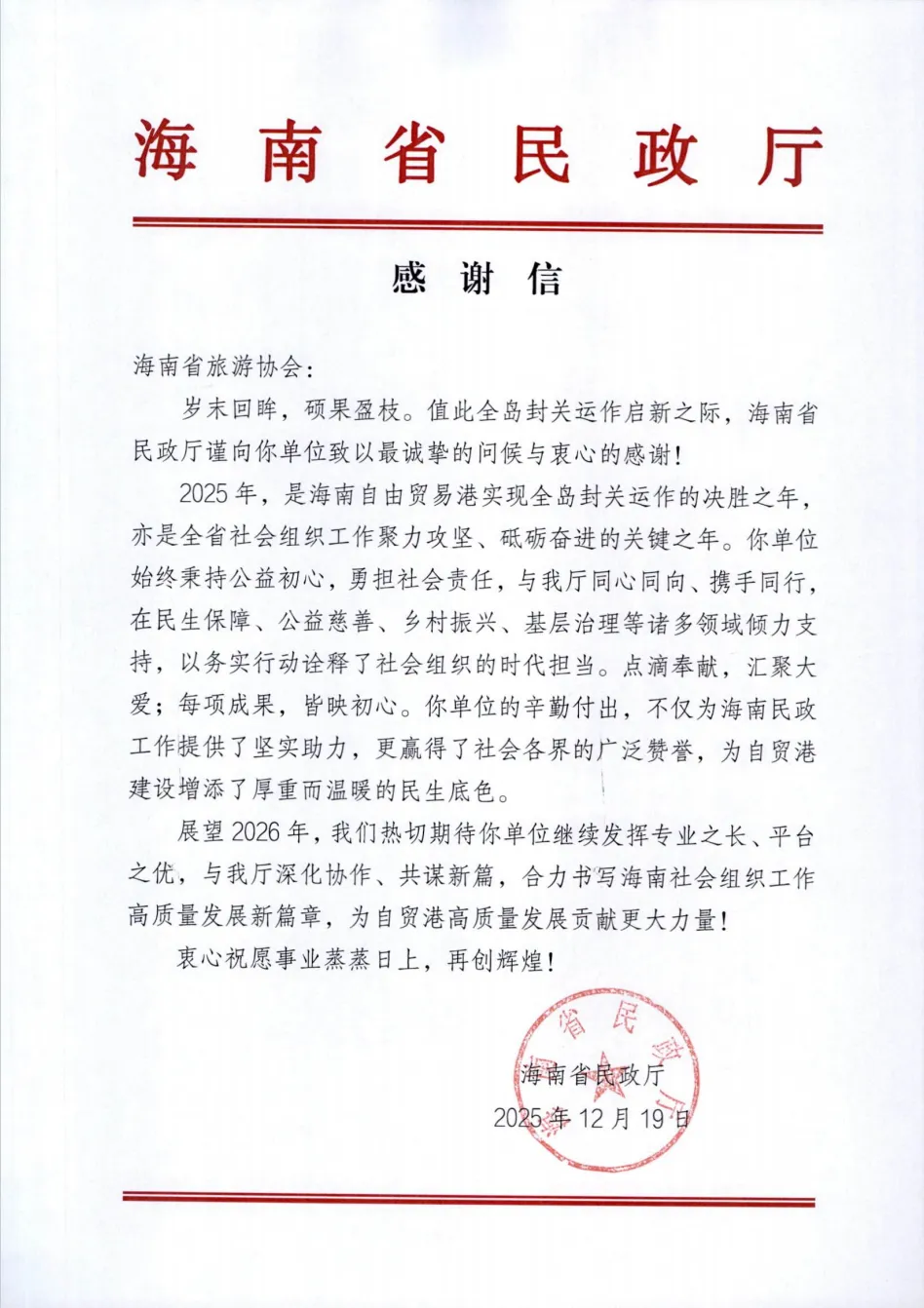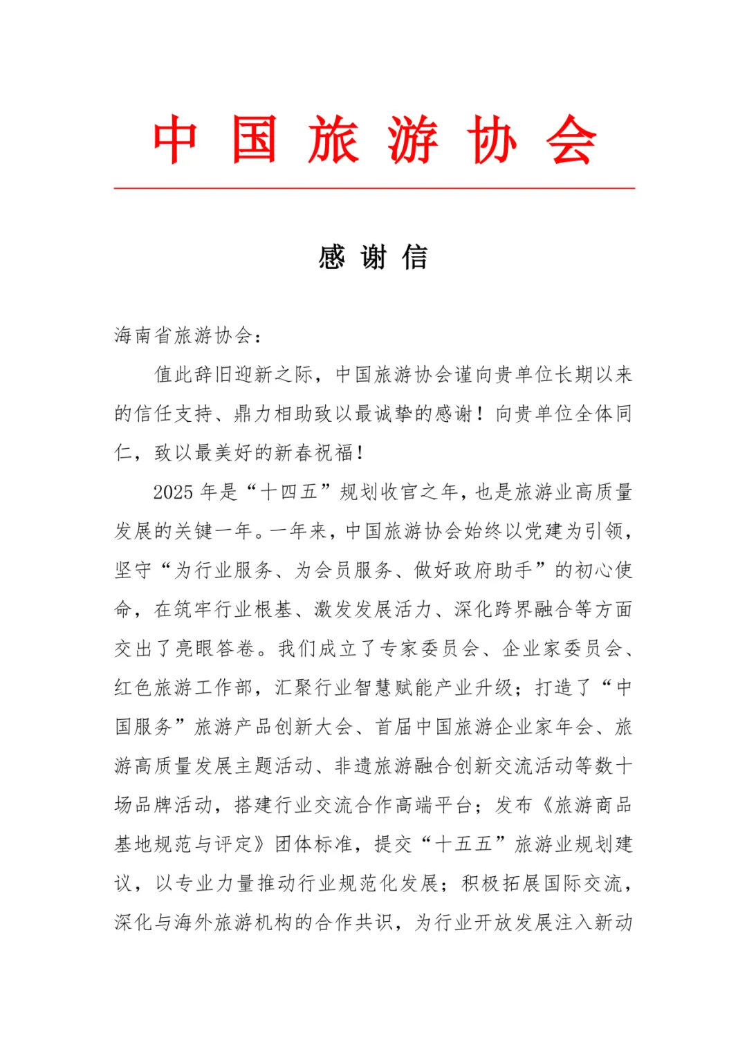 2025年,省旅游协会在省委社工部、省旅文厅和省民政厅的大力支持和指导下,在全体会员单位的协同配合下,充分发挥六大专业委员会职能,稳步推进党建融合、服务质量提升、产业赋能、人才培养、品牌打造等各项重点工作,成效显著,得到了省领导和有关主管部门的高度肯定,荣膺国家民政部“全国优秀社会组织”称号。