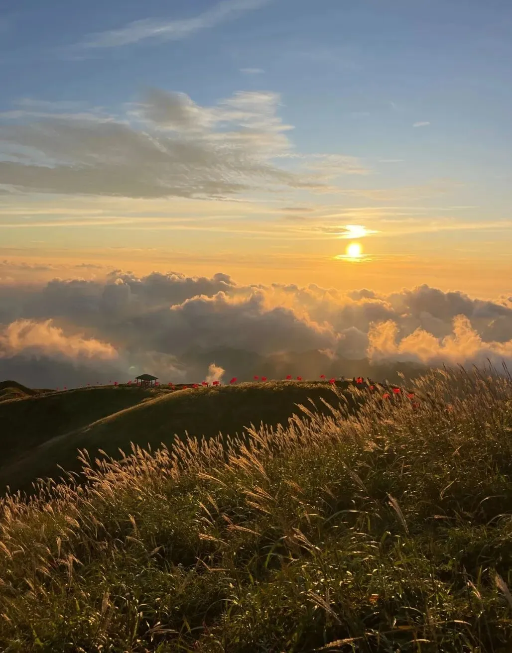 海拔1918.3米的金顶,是武功山的灵魂所在。雨后初晴的清晨,站在白鹤峰观景台,看第一缕霞光刺破云层,将整片云海染成橘红与鎏金。云雾时而如轻纱缠绕山峦,时而如惊涛从山谷倾泻而下,形成壮观的云海瀑布。金顶古祭坛群静静伫立,历经1700余年风雨,与云海日出相映,宛如仙境中的神殿。