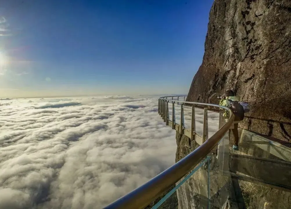 依山而建的星空栈道,部分路段为玻璃材质,行走其上,仿佛漫步云端。白天,可俯瞰草甸云海;夜晚,栈道灯光亮起,与头顶银河交相辉映,宛如一条通往星空的阶梯,惊险又浪漫。