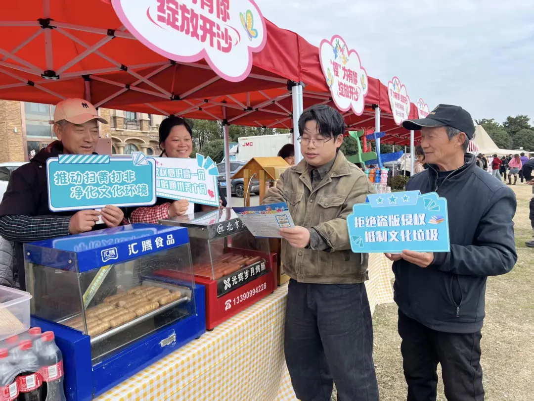 春日的途居露营地景区游人如织,开沙村新时代文明实践站志愿者在景区入口及游客服务中心设立了宣传咨询台,通过悬挂醒目的宣传横幅、摆放知识展板、发放“扫黄打非”宣传折页等方式,向过往游客和景区内的商户普及相关法律法规 。