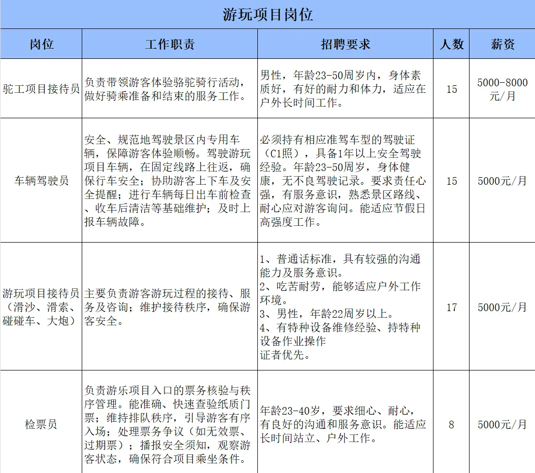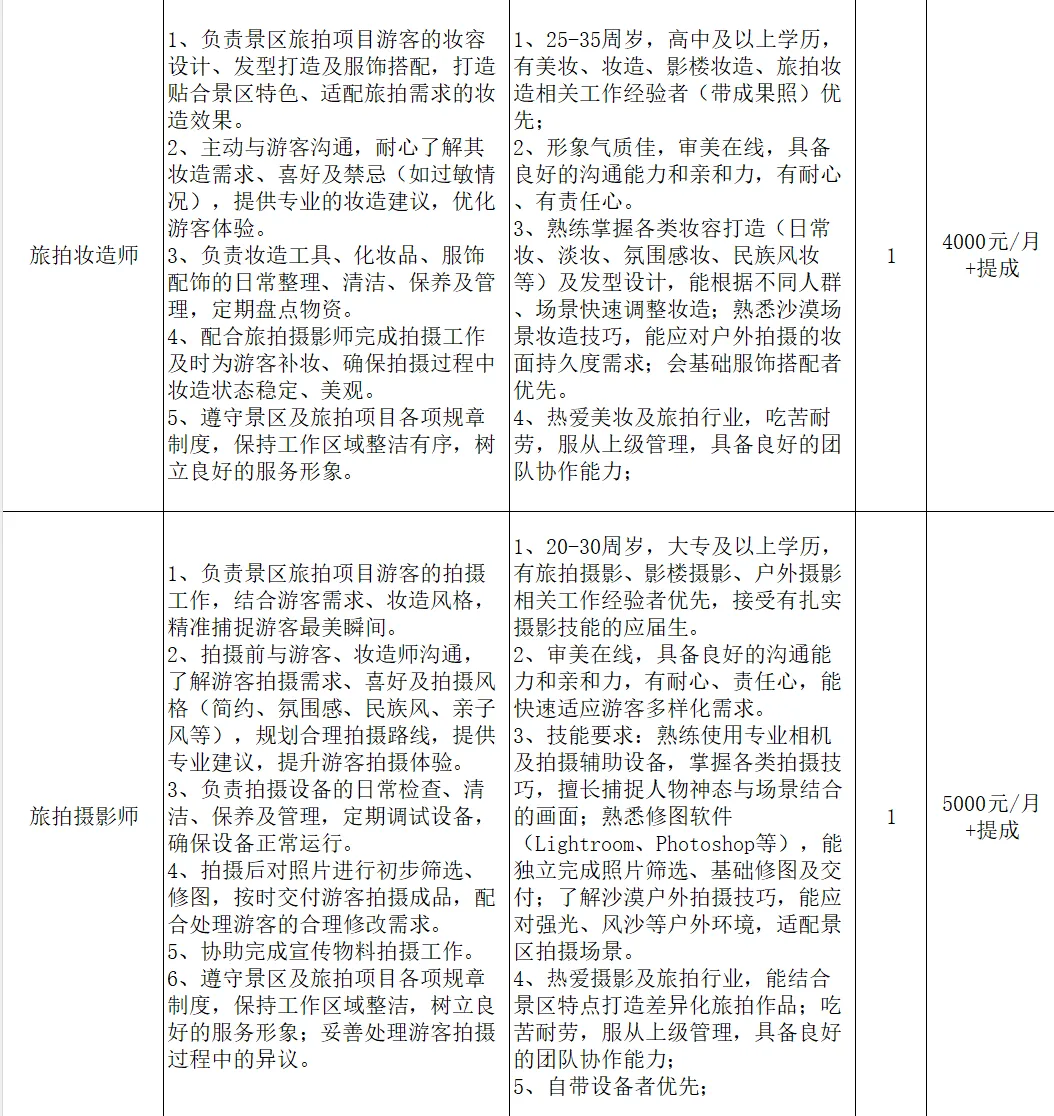 为助力景区2026年全新升级,完善人才梯队建设,提升运营服务品质,现面向社会公开招聘各类优秀人才,覆盖游玩服务、酒店度假、餐饮服务、企划营销四大板块,诚邀热爱文旅事业、志同道合的有志之士,携手共赴沙海之约,共筑文旅新辉煌!