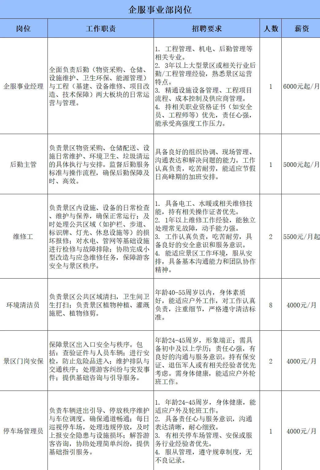 具备从业人员健康合格证明(健康证),身体健康,心理素质高,能够适应景区工作需求。