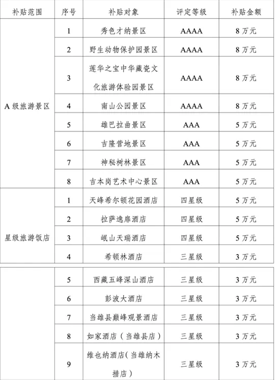 为激励我市涉旅企业提质升级,进一步提高旅游服务品质,完善旅游基础设施,推进我市文化旅游产业高质量发展。根据《2025年度拉萨市A级旅游景区、旅游饭店创建评定补贴方案》,对2025年1月1日—2025年12月31日期间创建评定3A级(含)以上景区和评定为三星(含)以上星级旅游饭店进行补贴,现对拟补贴对象名单公示如下: