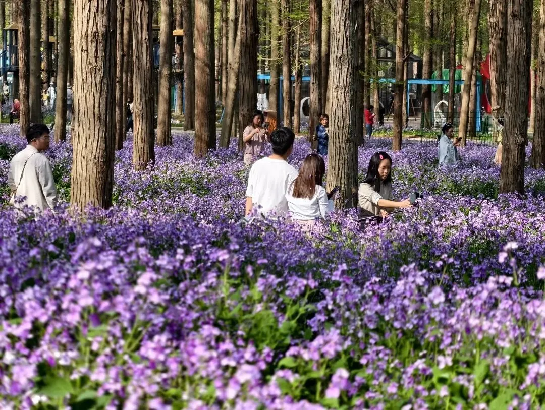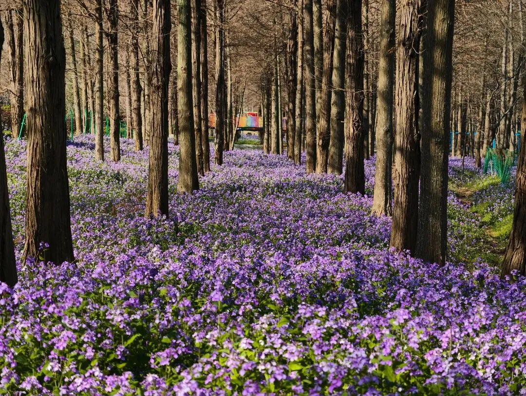 待到3月底至4月初,二月兰与樱花将接力盛放!情侣园内,1314棵落羽杉挺拔林立,大片紫色的二月兰铺就浪漫花毯,象征“一生一世”的爱情长存,是拍照打卡、亲子露营的绝佳去处。
