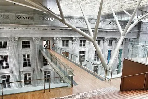 建筑超美:由政府大厦和前最高法院改建,树状支柱撑起走道,屋顶 15000 多片金色镂空铝板及玻璃,将自然光筛进展场,超绝!