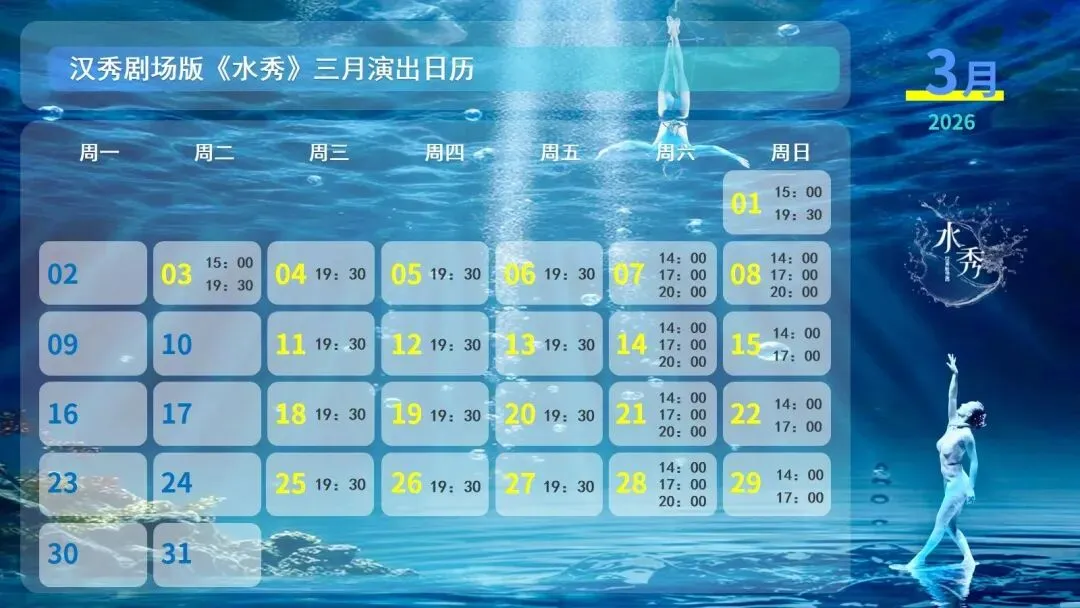 ②周二至周五,每天演出三场,每场开始时间为:11:30/14:00/16:00;