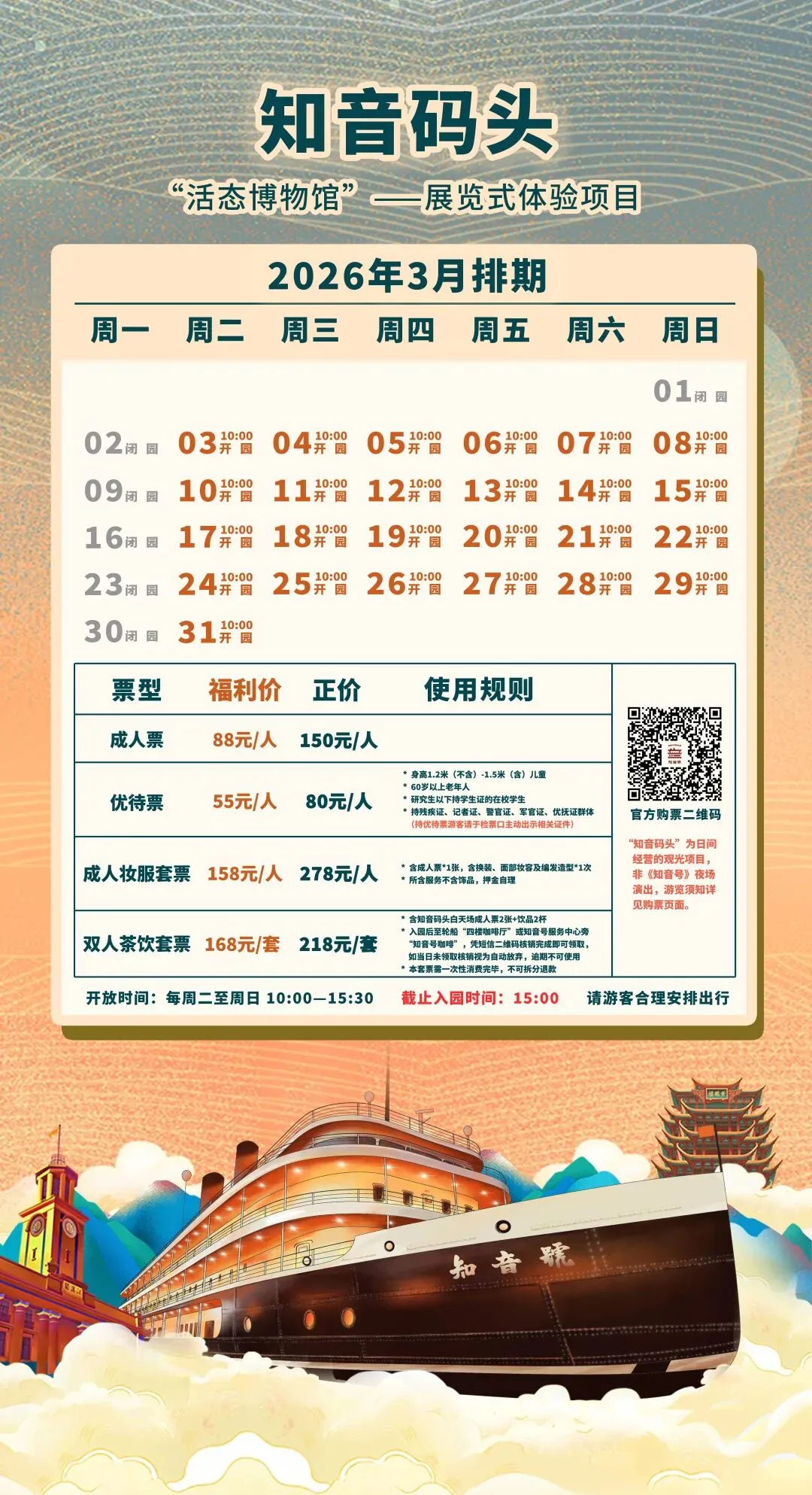 开航前十五分钟停止检票,请安排好出行时间请预约用户按景区规则有序排队。信息内容以景区现场为准,如遇特殊状况请及时联系景区工作人员。游船信息均在周期性更新,故请游客出行人员。前随时关注变动信息,以免耽误旅行。