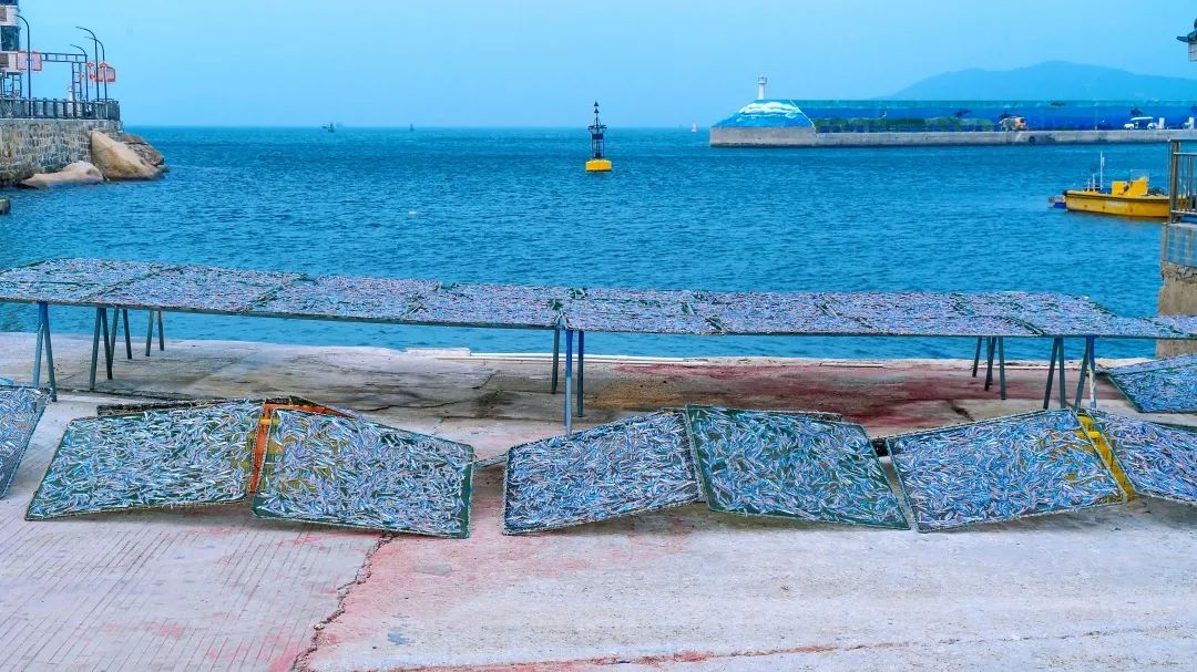路过晒鱼场的时候,大量的新鲜鱼虾正铺摊在太阳下