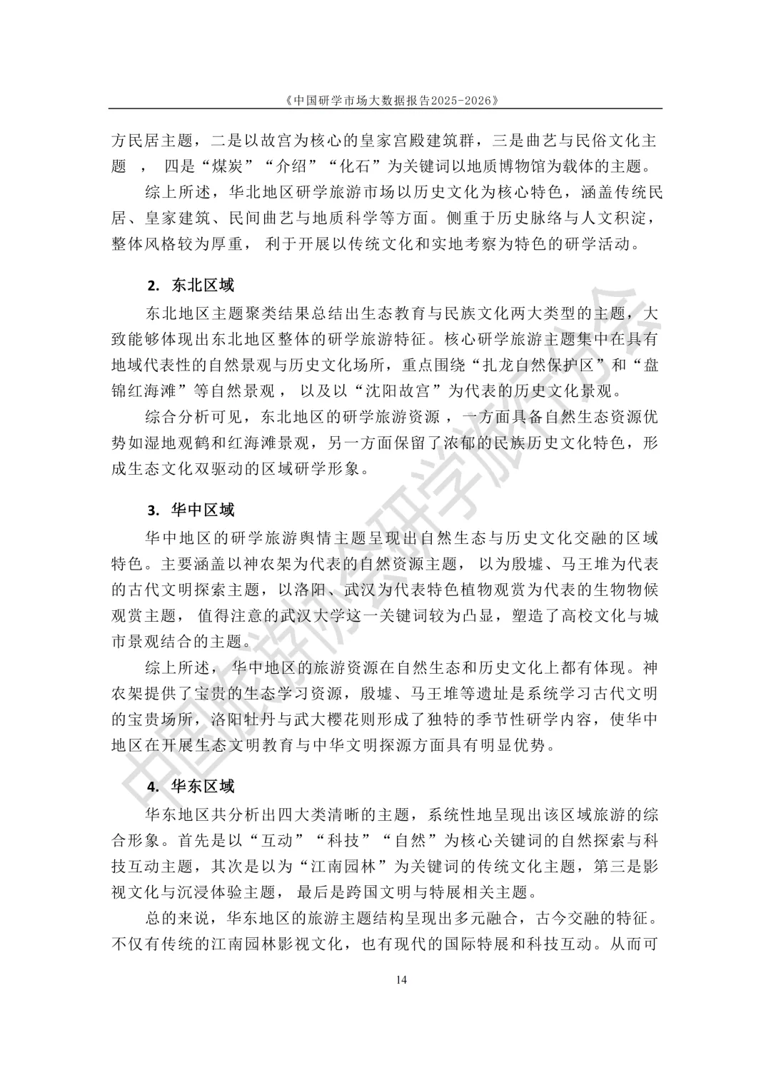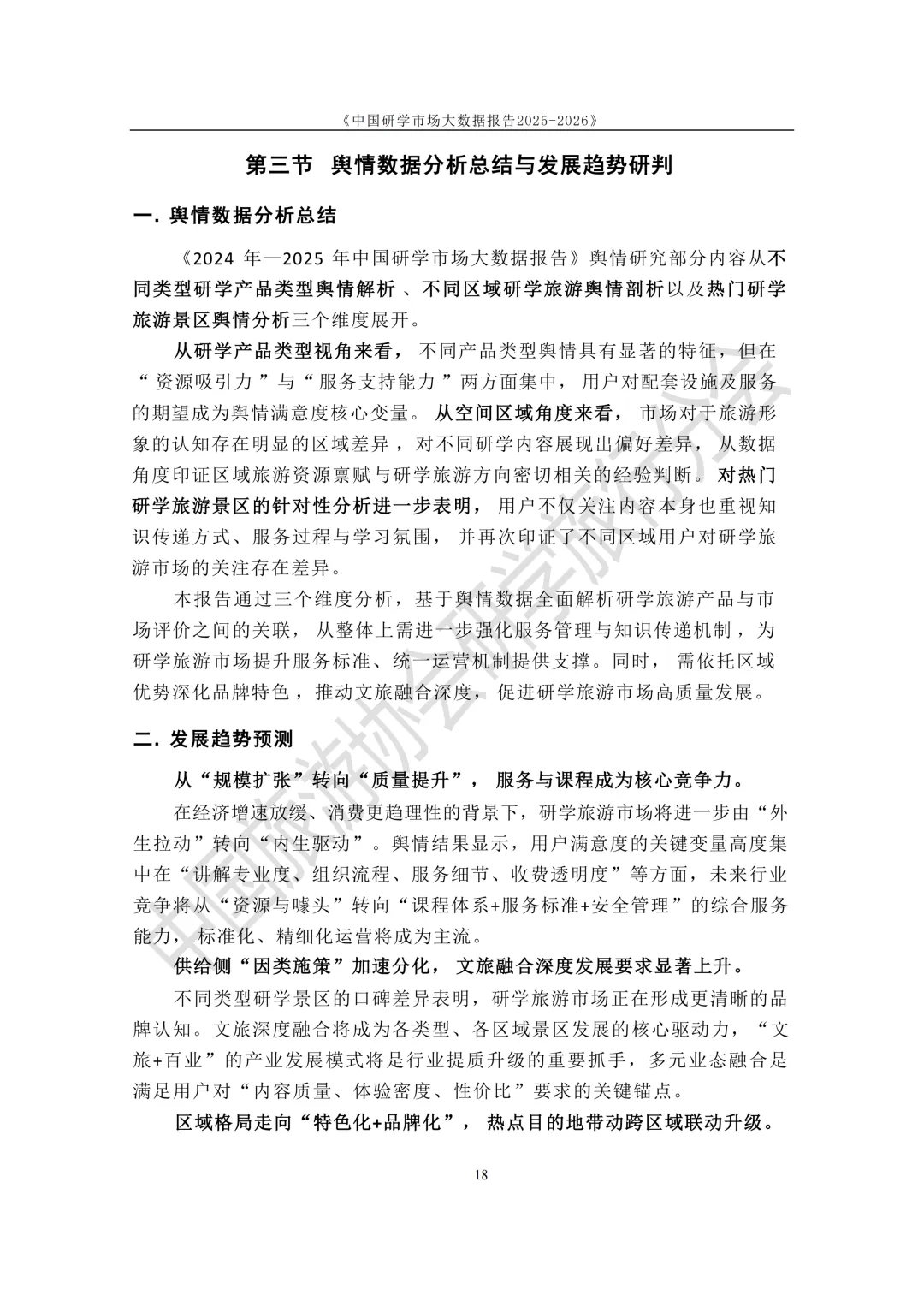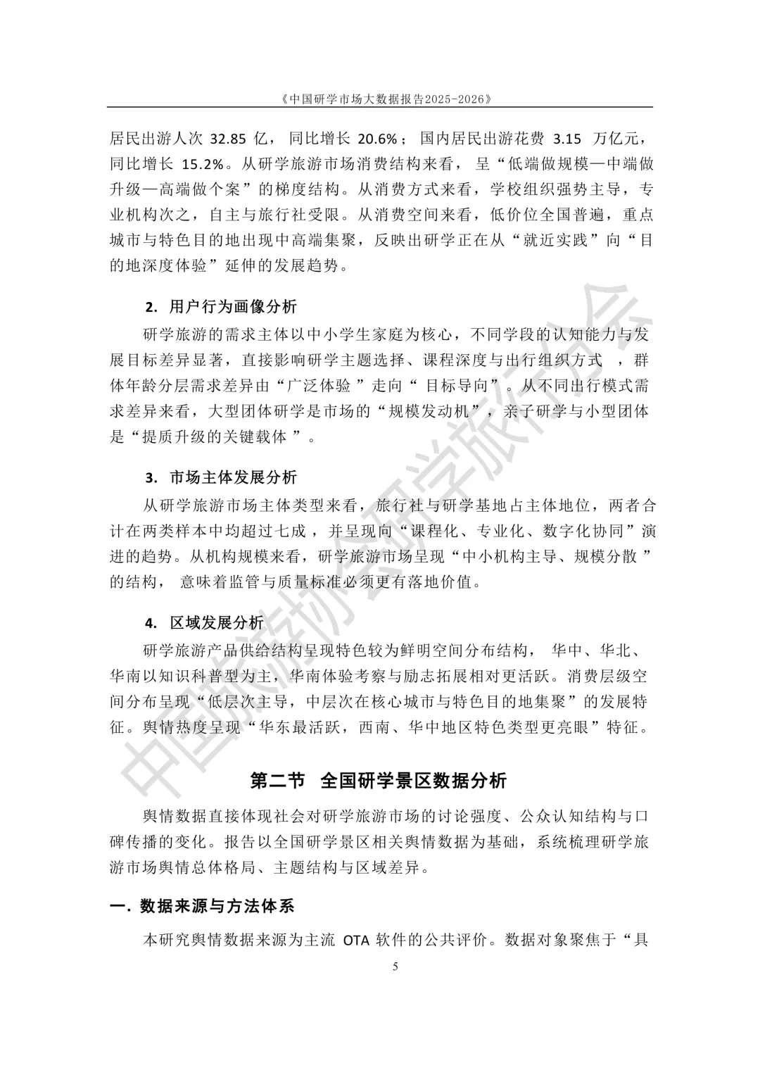 一、摘要 从旅游整体数据看,市场规模已经非常大。2024年国内旅游人数达到 56.15亿人次,旅游消费超过 5.7万亿元;2025年上半年出游人数 32.85亿人次,同比增长20.6%,说明旅游和体验式消费需求仍然在快速恢复和增长。 从用户结构看,中小学生家庭是核心消费群体。学校组织的大型研学团是市场的“规模引擎”,而亲子研学、小型团队则更偏向品质和体验升级。市场结构也呈现明显梯度:低端做规模,中端做升级,高端更多是定制化产品。 从市场格局来看,当前研学机构以旅行社和研学基地为主,两者占比超过70%,但行业整体仍然比较分散,中小机构数量很多,标准化和服务质量仍有提升空间。 报告最后给出的判断也很明确:未来研学行业竞争不再只是拼景区资源,而是拼课程内容、服务质量和安全管理能力,行业会从“规模扩张”逐步转向“质量竞争”。 二、报告部分内容