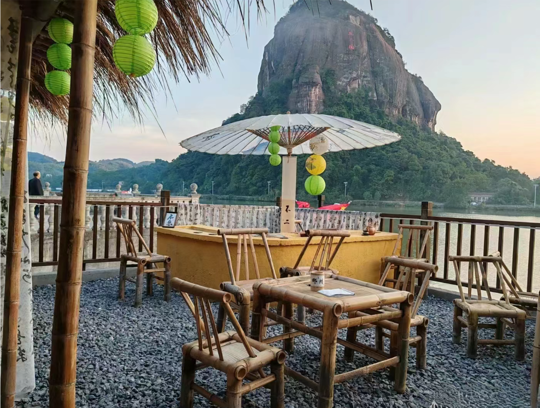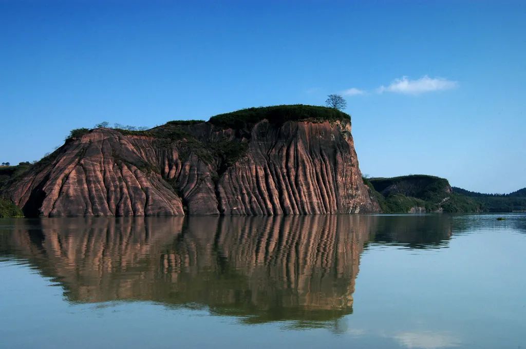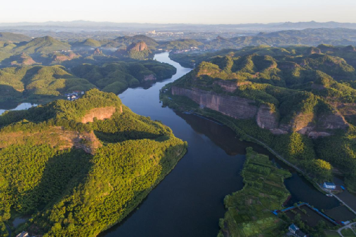 江边丹霞飞天山的倩影,草木的风姿,山上的亭隅,宛如一幅展开的写意画在你眼前铺开。