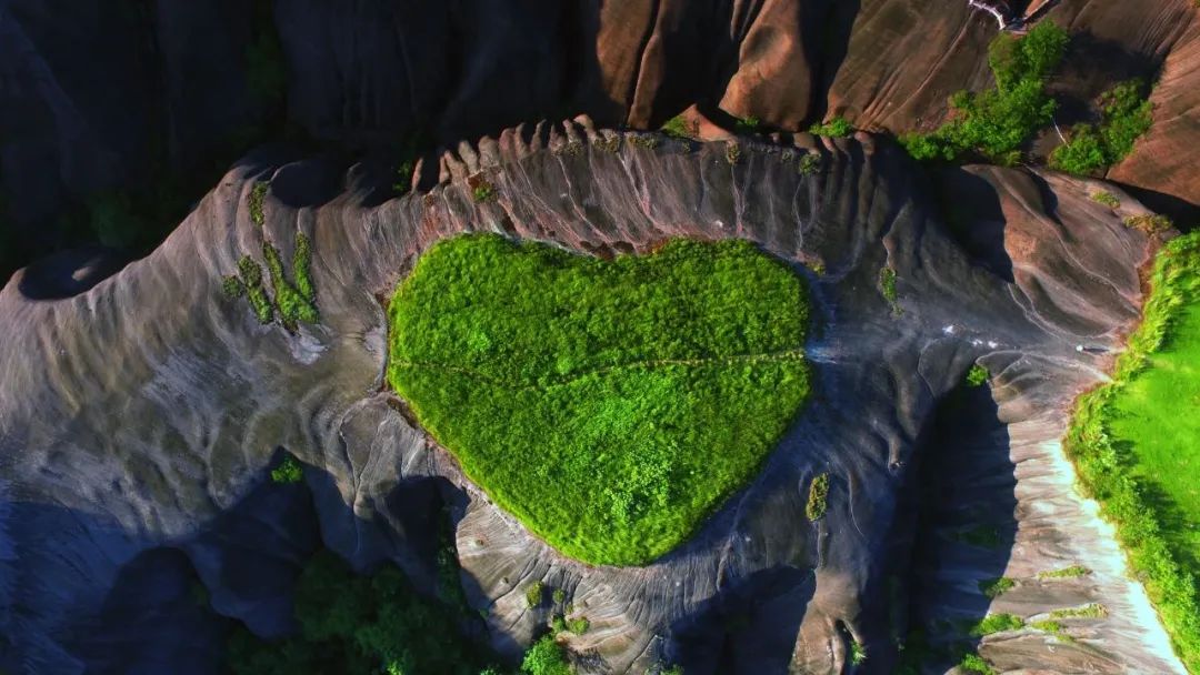 飞天山的丹霞之心,一颗巨大的爱心仰卧在丹霞山体上,是大自然把思念熬成拥抱。