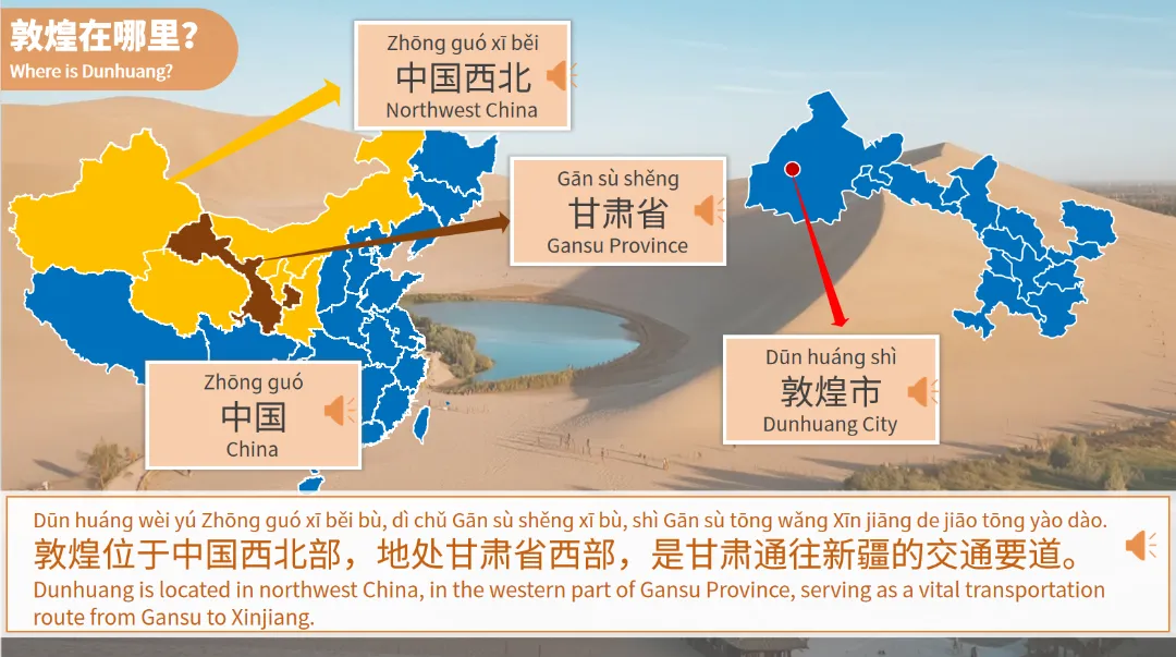 通过地图的直观展示,学习者可以迅速掌握敦煌在中国乃至西北地区的具体位置,为后续的文化探索奠定地理基础。