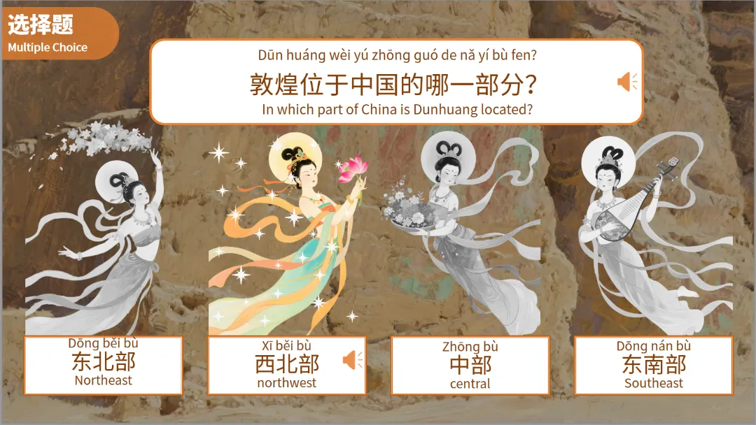 在选择题中,学习者需要判断敦煌位于中国的哪一部分,通过思考和选择,加深对敦煌地理位置的记忆。