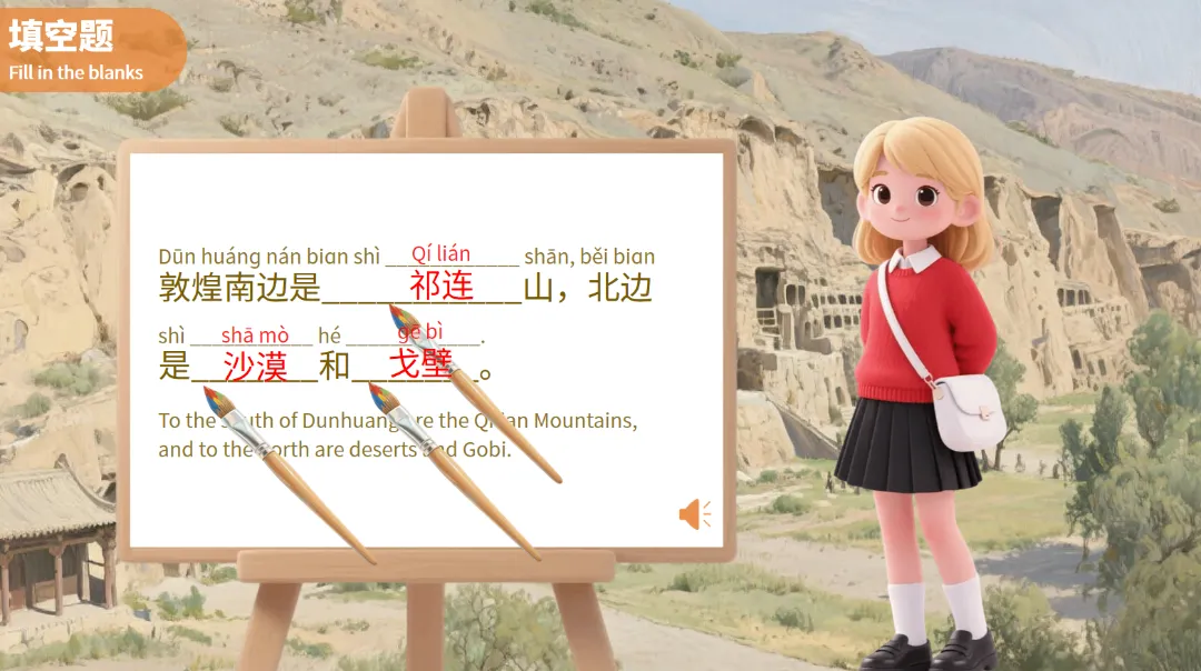 填空题则让学习者填写敦煌南边和北边的地理特征,如祁连山和沙漠、戈壁,进一步巩固地理知识。