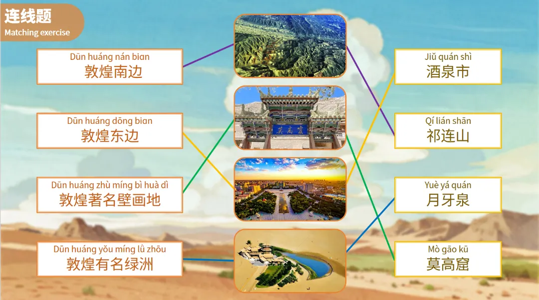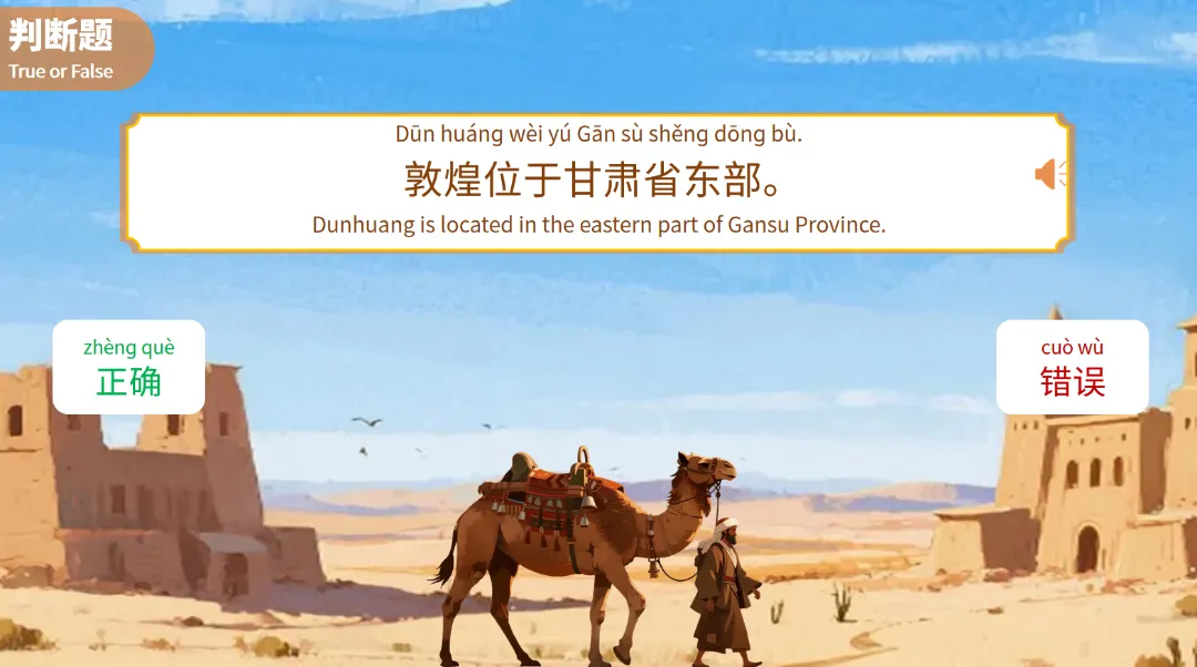 判断题和连线题则分别考察学习者对敦煌相关陈述的判断能力和对敦煌著名景点、地理特征的了解程度。