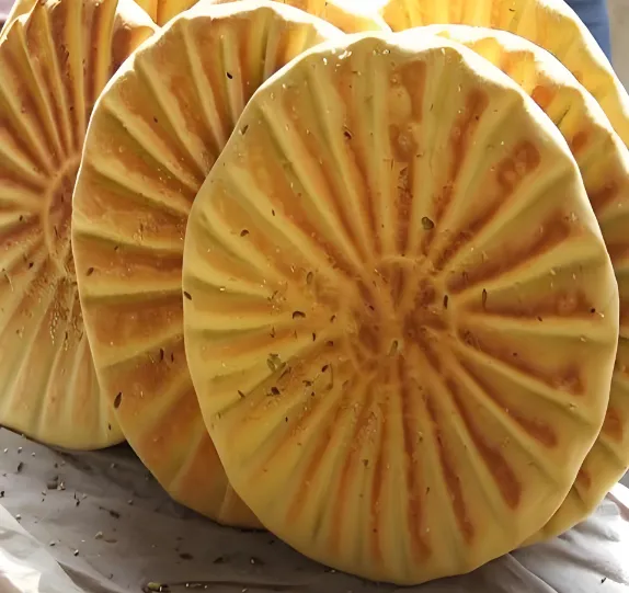 第二美食:乾州锅盔外观呈圆形,边薄心厚,像菊花一样。干嚼酥脆,越嚼越香;泡在羊肉汤里,吸满汤汁,软糯入味。这可是当年修乾陵时工人的干粮,耐饥耐贮。在袁家村或者街头巷尾都能买到,一定要买现烤的!