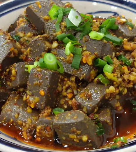 第四美食:辣子蒜羊血这道菜看着“重口”,吃着“上头”。羊血切成小方块,在滚水里焯熟,浇上红油、蒜泥、葱花。羊血嫩滑,辣子香而不燥,蒜香浓郁,一口下去,汗毛孔都打开了。兴平市的“老王家”做得最地道。