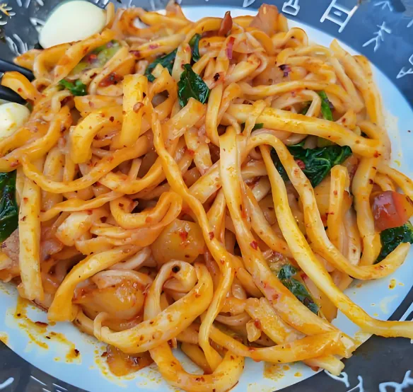 第五美食:汇通面咸阳人的“深夜食堂”。这是一种干拌臊子面,面条筋道,臊子肉粒粒分明,配上胡萝卜、土豆丁,再浇上一勺滚烫的油泼辣子。晚上10点后去汇通夜市,坐在小马扎上大口吃面,那是咸阳人特有的豪爽。