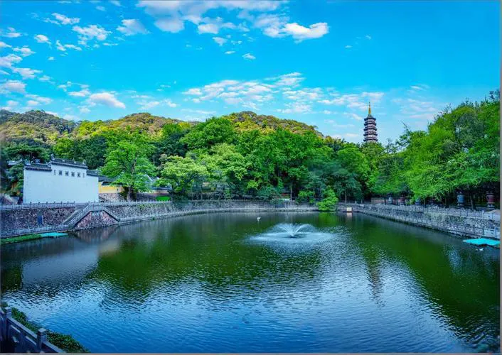 万工池(外万工池):进入山门前的放生池,水面如镜,倒映着青山古塔,是拍摄天童寺经典画面的地方。