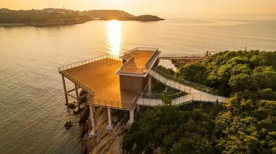 海上玻璃栈道:透明玻璃栈道旁有松树,晴天时海天一线,景色绝美。