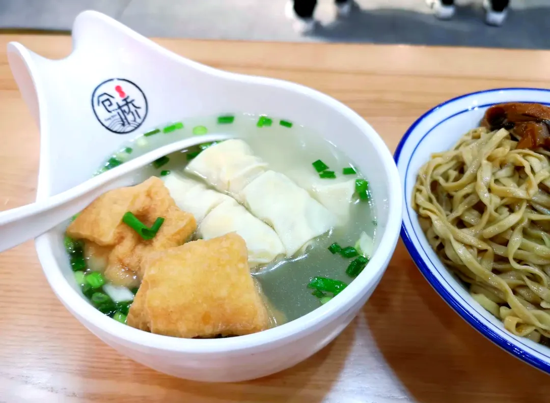 5、仓桥面结面:手工面搭配四个面结、两个油豆腐、少许青菜,拌辣酱食用,汤头鲜美,面结软嫩。