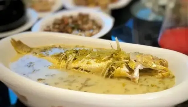 9、雪菜大汤黄鱼:以雪菜提鲜,黄鱼炖煮至汤色乳白,鱼肉鲜嫩,汤头鲜美,体现“鲜咸合一”的精髓。