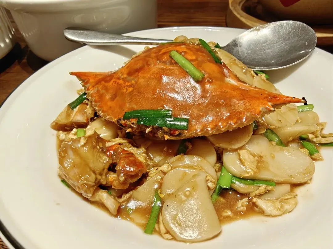 11、白蟹炒年糕:梭子蟹与年糕同炒,蟹鲜渗入年糕,糯而不粘,鲜香四溢。