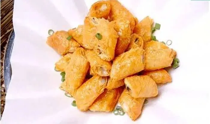 19、腐皮包黄鱼:用薄豆腐皮包裹新鲜黄鱼肉,油炸后外酥里嫩,蘸醋或番茄酱食用,风味绝佳。