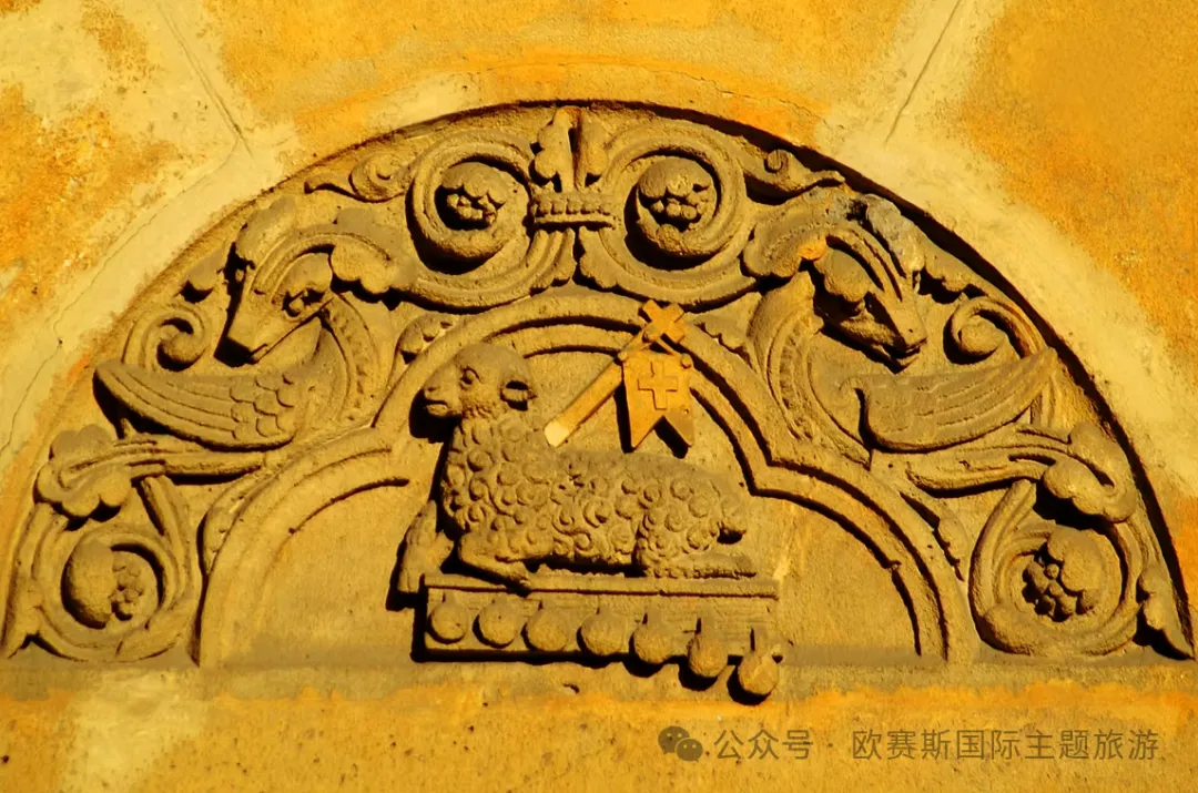 教堂门廊 装饰极为细腻:六对立柱间的浮雕与雕像交相呼应,门楣上方的“上帝的羔羊”浮雕象征基督的牺牲与救赎,三角山花下的基督像与使徒雕像环绕其间,庄严而肃穆。