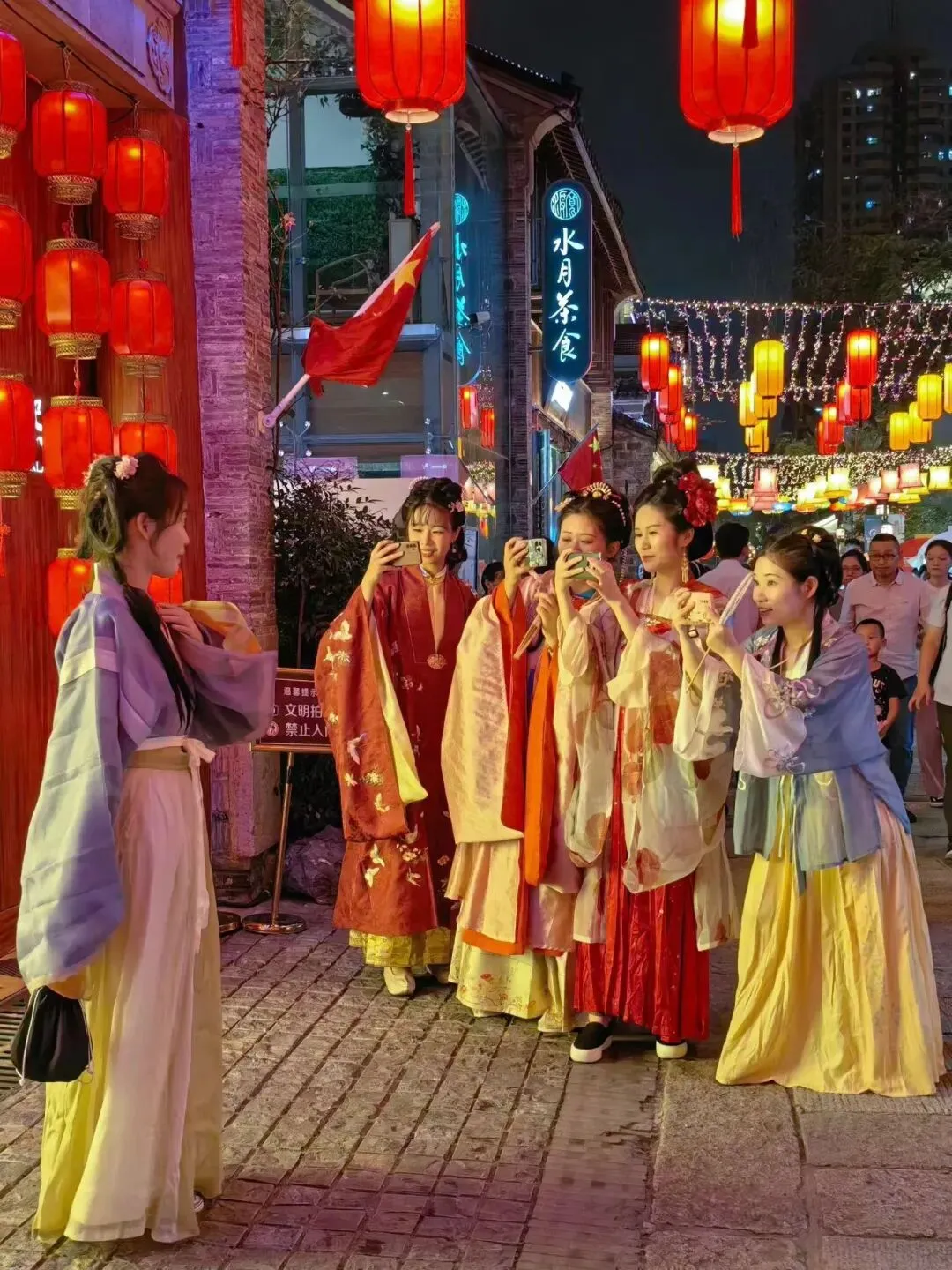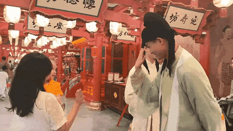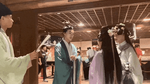 他们顶着千篇一律的韩式平眉、浓密假睫毛,披着流水线量产的飘逸汉服,裙摆拖地却踩在毫无肌理的水泥仿青石板上,定点站在仿古牌坊下,机械地比心、歪头、撩裙摆,供游客打卡拍照。