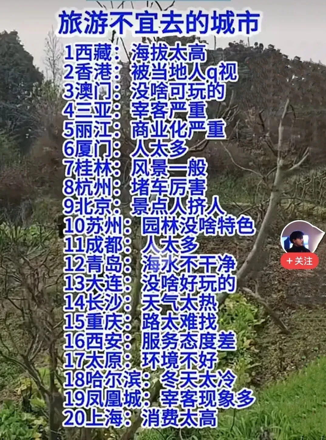 您现在的位置是:首页 > 国内旅游目的推荐 > 正文 国内旅游目的推荐 网曝旅游不宜去的20个城市,谁去谁糟心 admin2026年03月11日 09:02:23国内旅游目的推荐11 网曝旅游不宜去的20个城市,谁去谁糟心 转载请说明来源于"旅荐网",部分内容转载自网络,如有侵权请联系qlwl@foxmail.com删除 本文地址:https://www.15386.cn/post/140344.html 上一篇 郑董的宁海希尔顿双朋,商务旅游环境一流, 下一篇 【西安旅游】大唐不夜城2026年3月份常态演出节目单时刻表&表演位置图 相关文章 寻春味指南��️跟着我去旅行! #西藏 #高原旅行必备指南 自驾游攻略 #藏式 新疆旅行别乱跑伊犁旅游环线7日攻略 旅游攻略(山西大同) 2026年大连旅游攻略最全版 4天3晚玩转大连!五一来大连 这份,全家老小都适合 昆明旅游(五天旅行攻略)详细版 长春出发丨清明旅行,保姆级攻略. 集美大社很好逛!厦门旅游攻略 #西安春季旅游攻略 昆明抚仙湖4月中四天四晚旅游攻略-景点篇 发表评论 取消回复 评论列表 这篇文章还没有收到评论,赶紧来抢沙发吧~