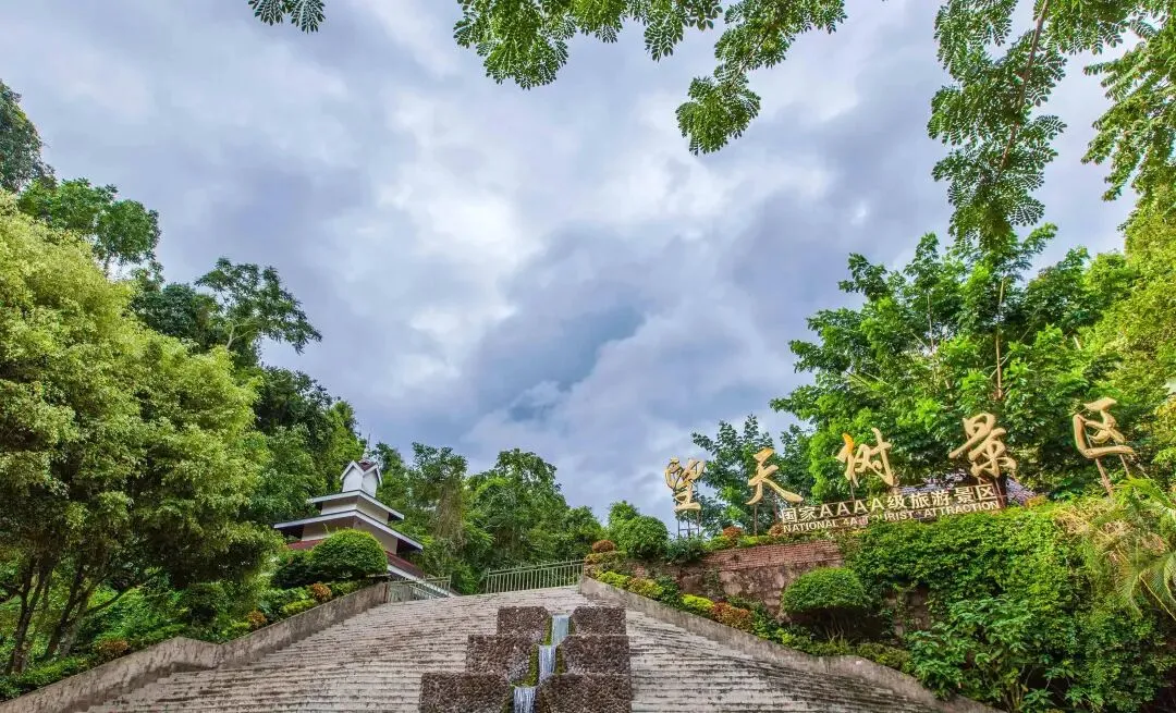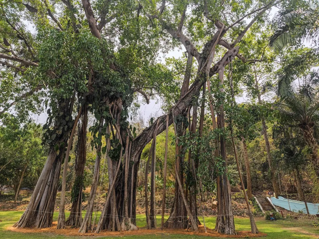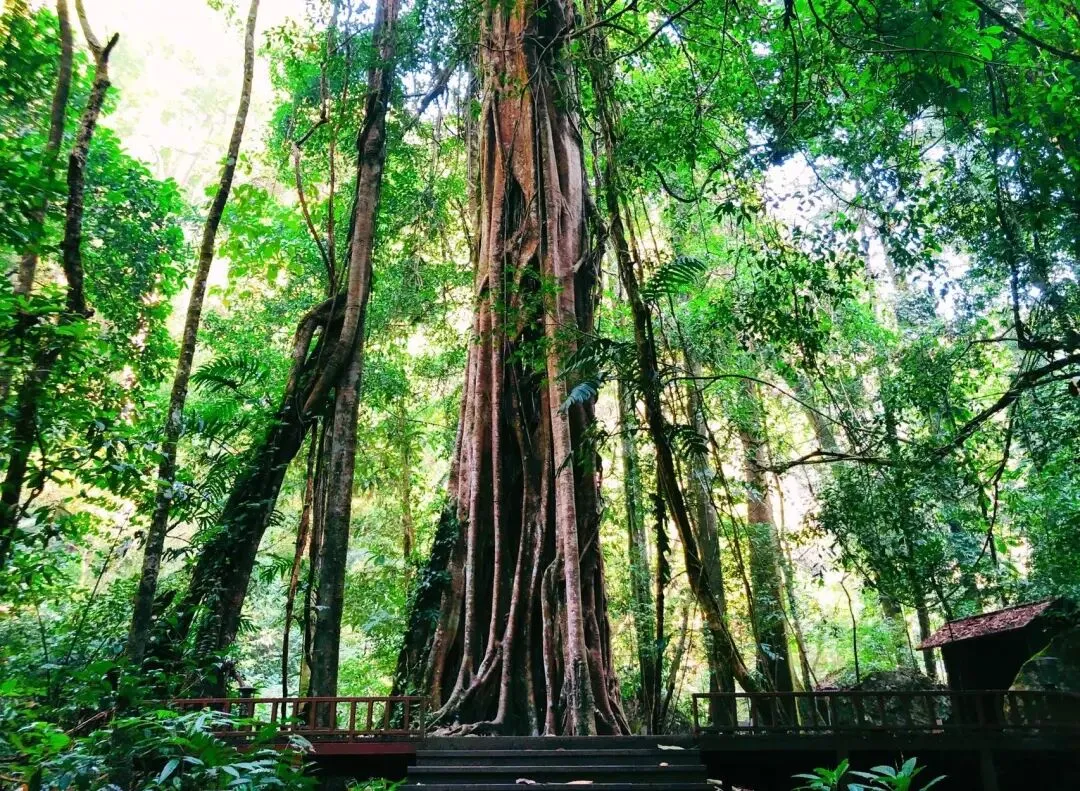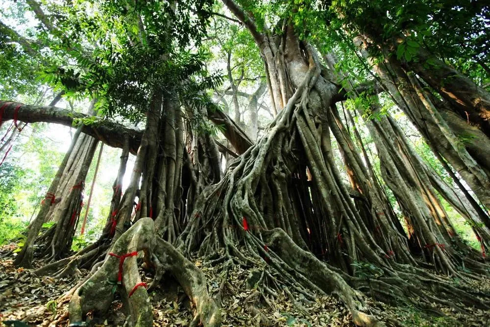 自然奇观:独树成林,一棵高达50多米的古榕树,树龄超1000年,树幅地面面积达2200平方米。榕树左右两侧主枝上有36条气生根,垂直而下、相互交缠,扎入泥土形成根部相连的丛生状支柱根,塑造出“一树多干”的奇特景致,宛如一片茂密的森林,打破了“独木不成林”的常识。这一景观是热带雨林中的一大奇观,展现了大自然鬼斧神工的艺术魅力,成为摄影爱好者和户外猎奇者的首选打卡地。