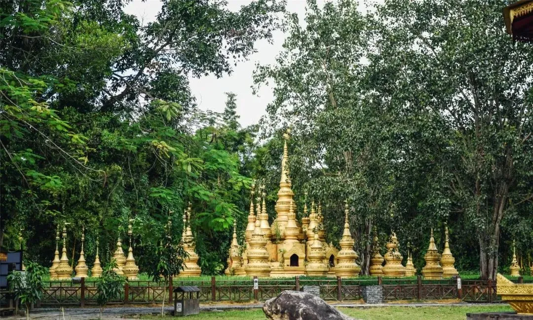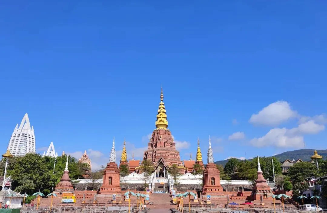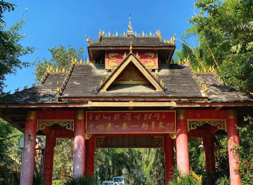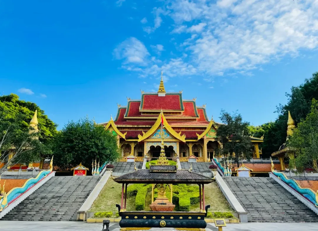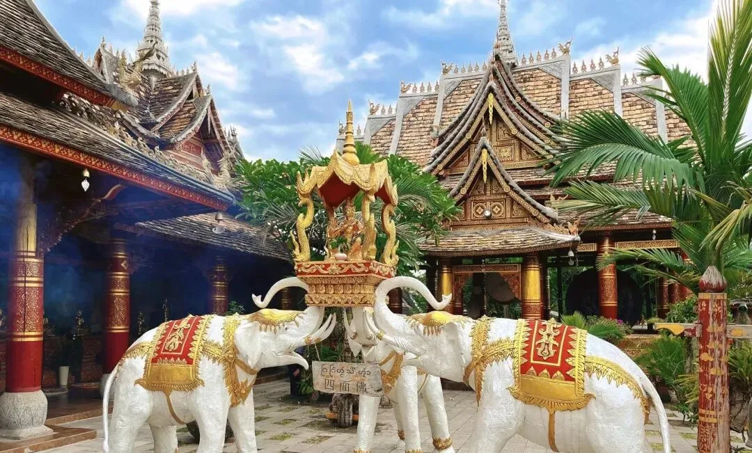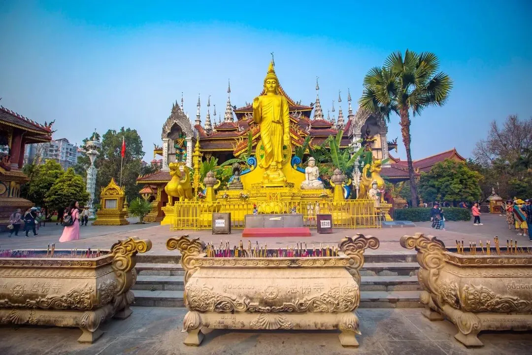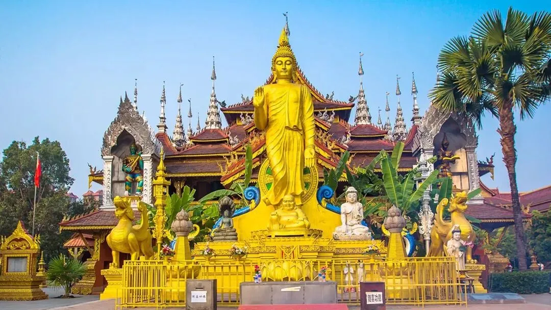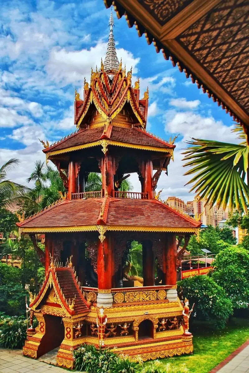 总佛寺:1400年历史,融合东南亚佛教特色与傣族传统元素,金箔沉淀包浆,瓦当刻贝叶经文。