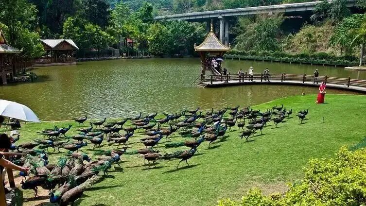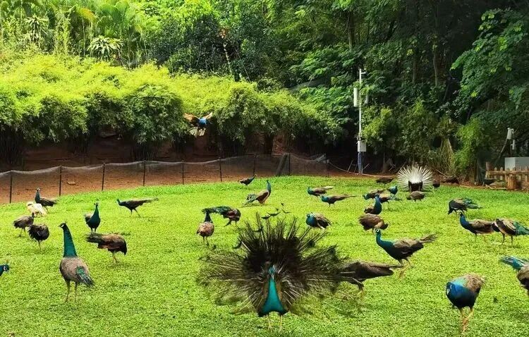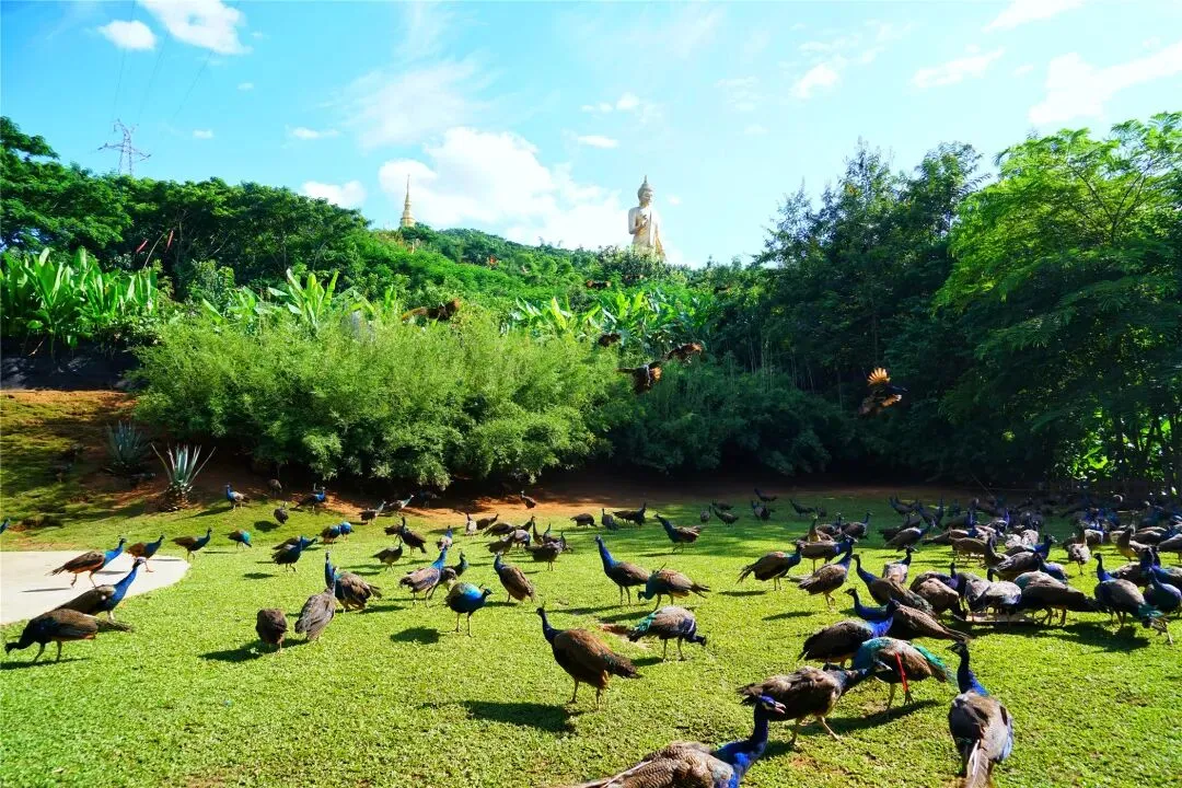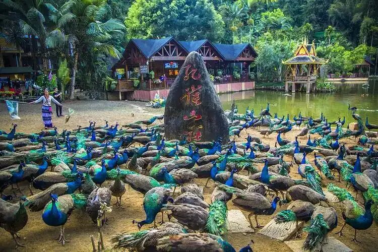 孔雀文化园:每日定时放飞百只蓝孔雀,游客可观赏到孔雀从山顶俯冲而下的壮观景象。