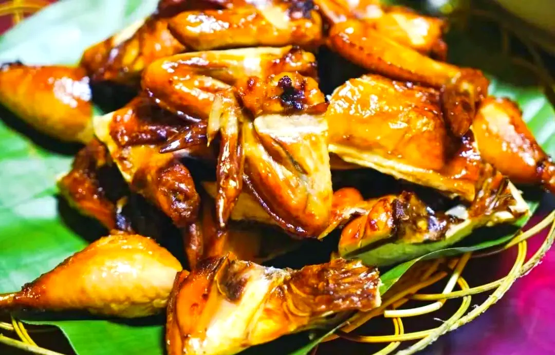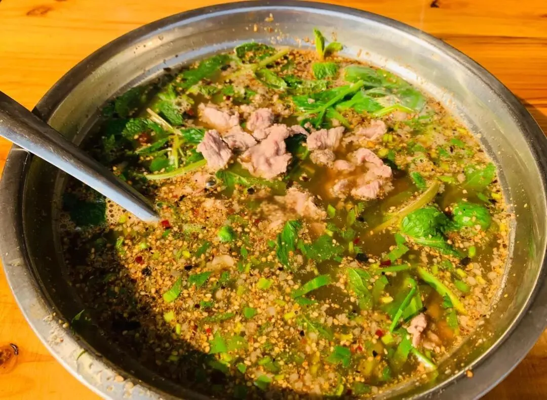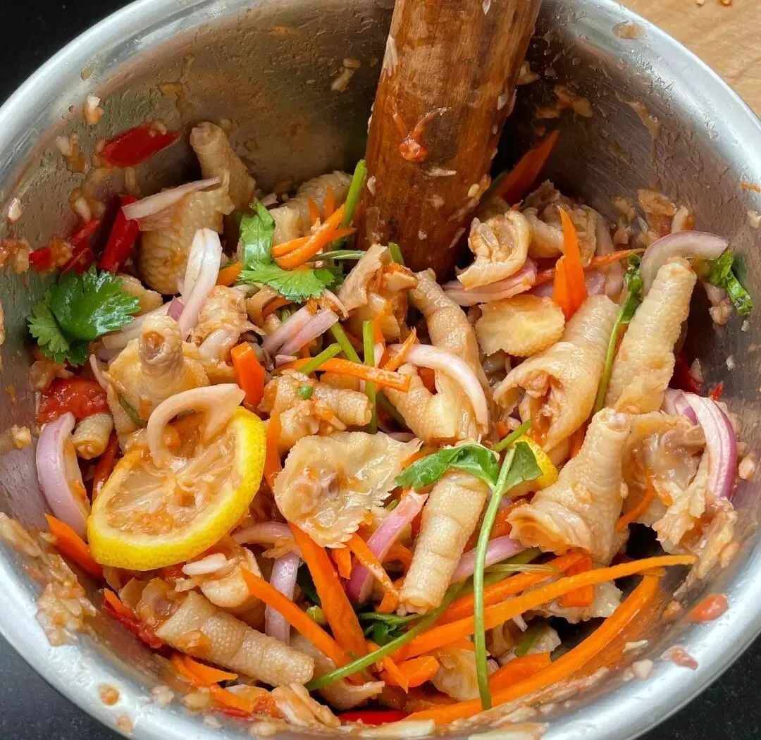 3、舂鸡脚:将鸡脚与各种香料和蔬菜一起舂碎,酸辣开胃,是热门小吃。
