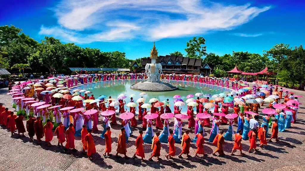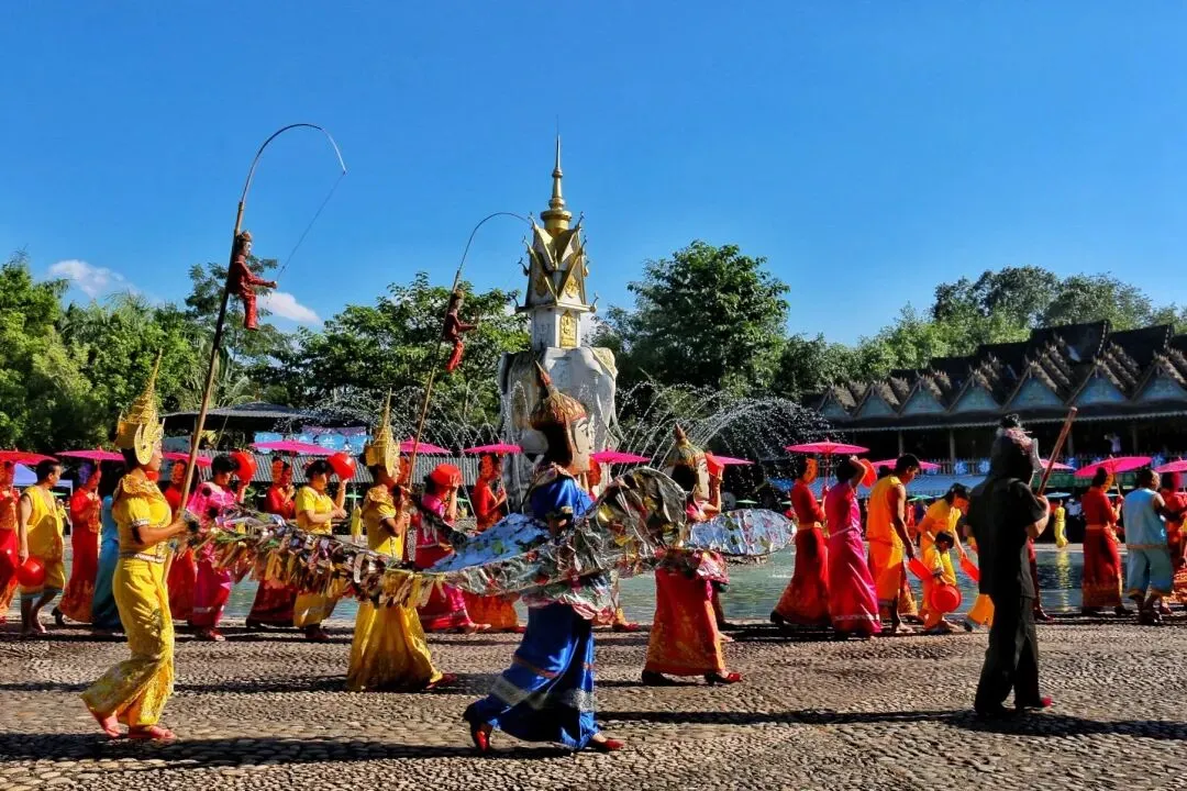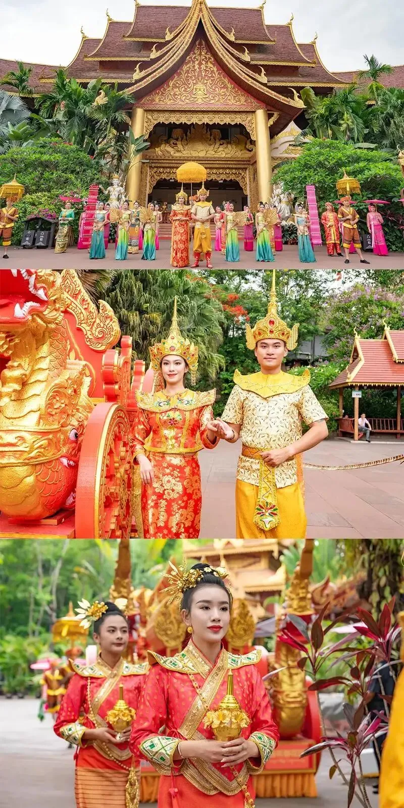 傣王巡游:每日11:00从傣王行宫出发。傣王、王妃率领皇室成员游园,王妃华盖投下贝叶经纹样光影秀,凤尾竹排列成天然取景框。