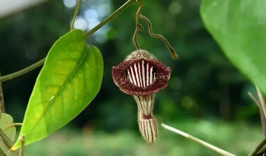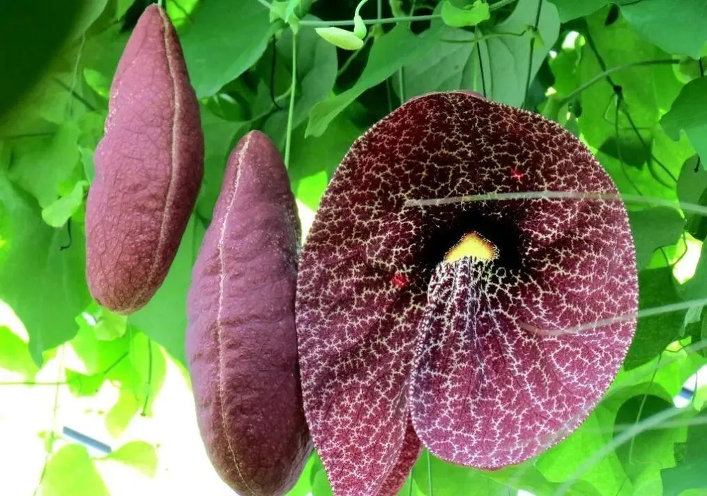 烟斗马兜铃:花冠淡绿色,布满深紫色斑点,花冠弯管状,整体自下而上呈“S”形弯曲,像极了一只只带有花纹的精致小烟斗。