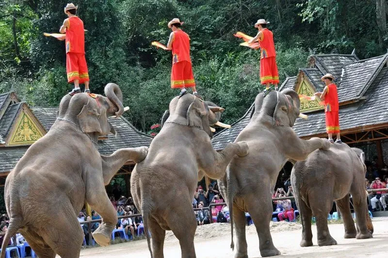 大象表演:时间(10:30、14:50、16:30)。大象踢球、跳舞、过独木桥,表演后可投喂大象(50元/位,可带一名小朋友)。