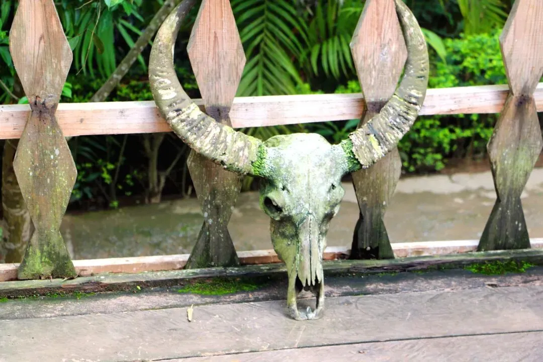 牛角路:木桩上挂着牛角,并写有基诺族的谚语,是了解基诺族文化的一条独特路径。
