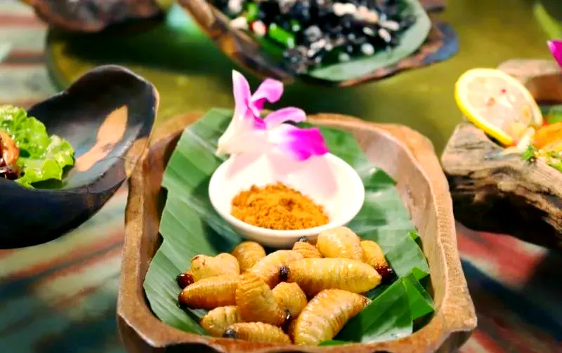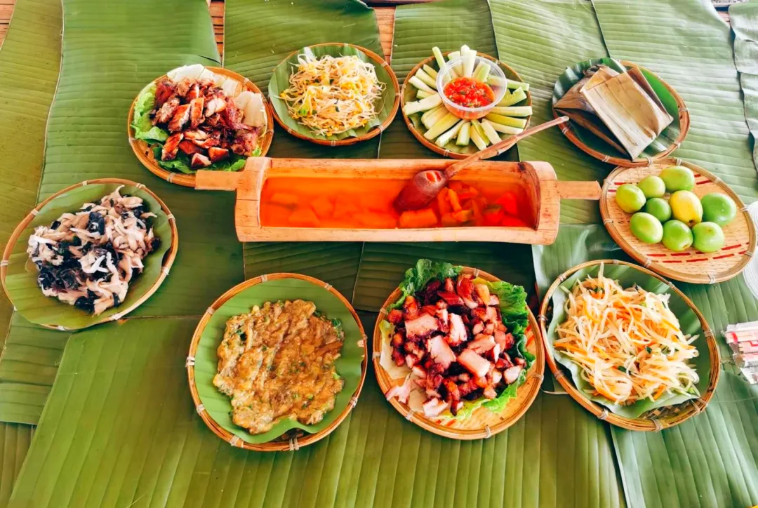 雨林私宴:在竹楼里用芭蕉叶包烧鱼配古树茶,品尝基诺族的特色美食,如酸蚂蚁酱等。