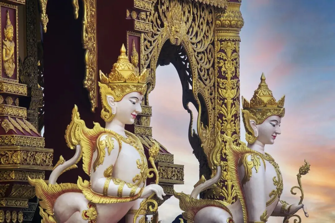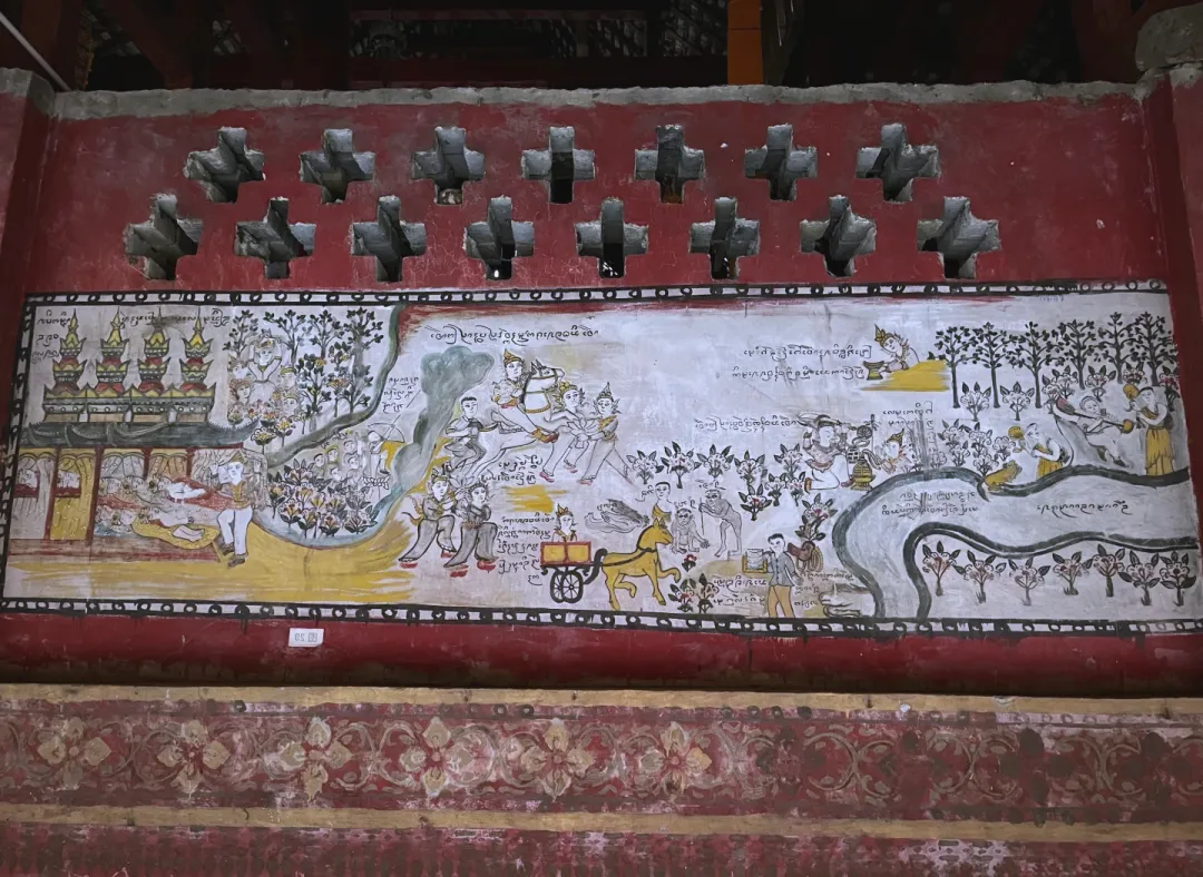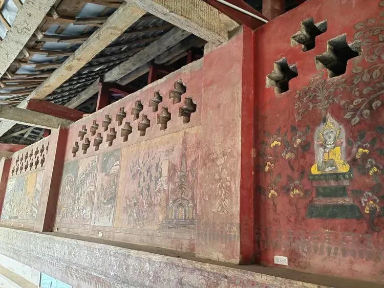 大殿(维罕):金箔装饰的傣式飞檐,殿内供奉7臂神佛(7个龙头状手臂从后背伸出曲于头颅上方),墙壁绘有《佛本生经》连环画。