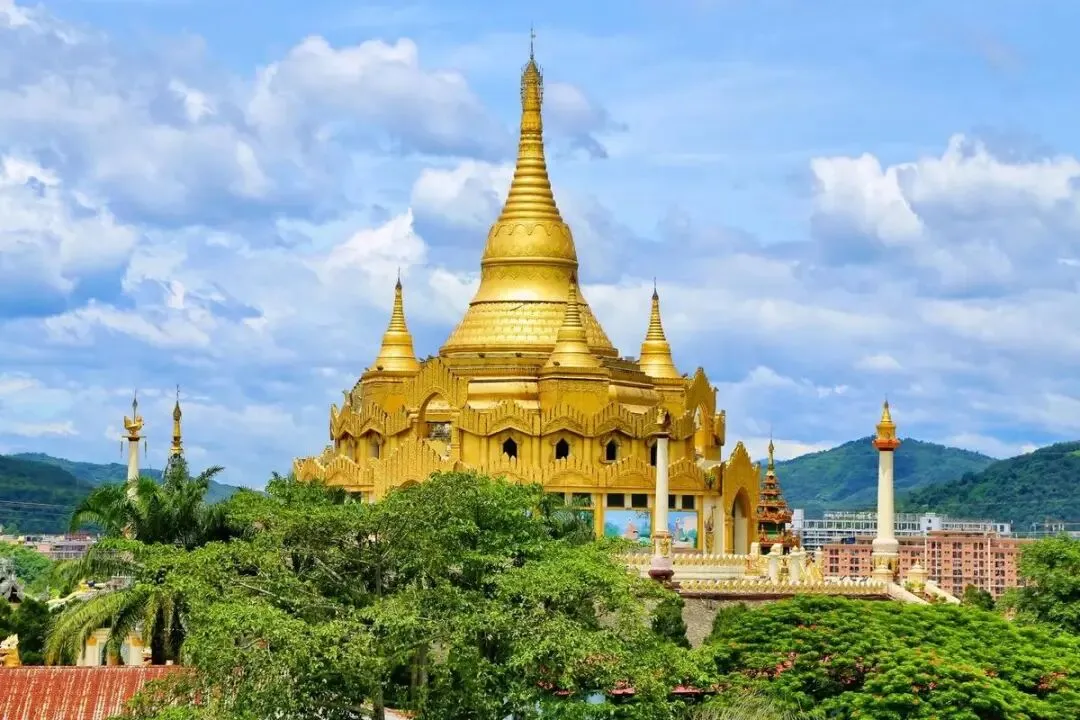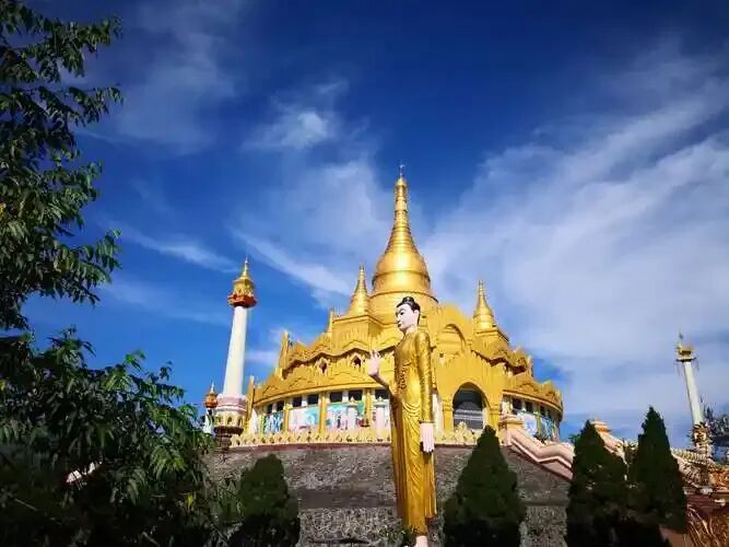中缅友谊大金塔:位于缅甸掸邦东部第四特区勐拉境内,金碧辉煌,象征中缅友谊。塔周环绕亭台楼阁和护法神狮雕塑,气势恢宏。