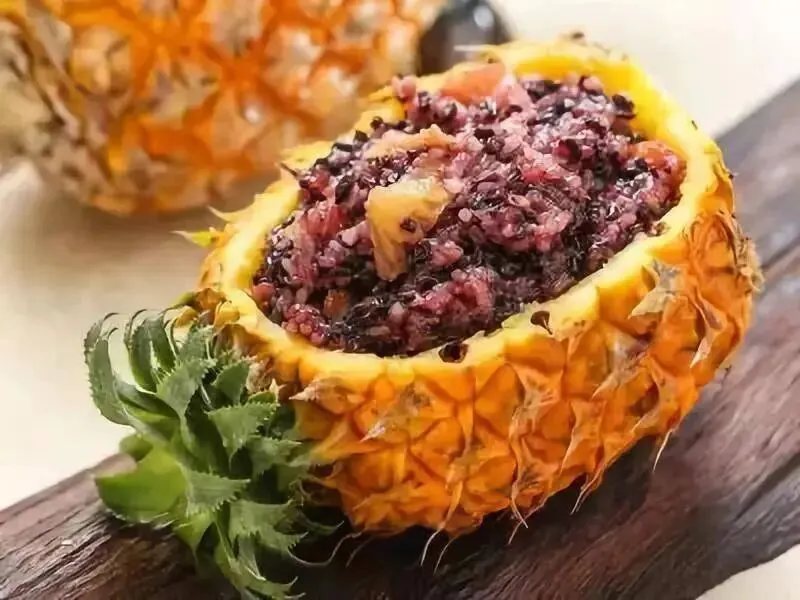 2、菠萝紫米饭:将紫糯米放入菠萝壳中蒸制,甜而不腻。