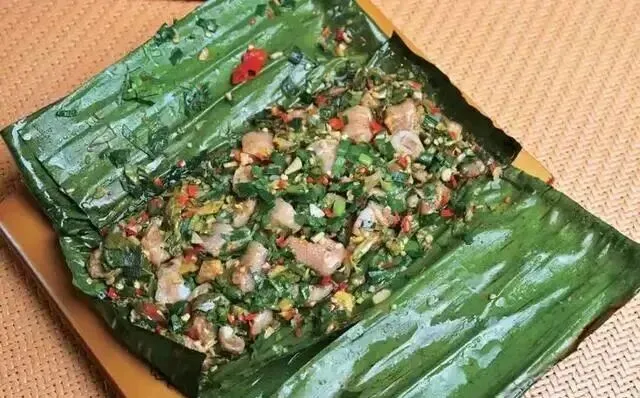 4、包烧:用芭蕉叶包裹食物(如金针菇、鱼肉等)进行烤制,保留原汁原味。
