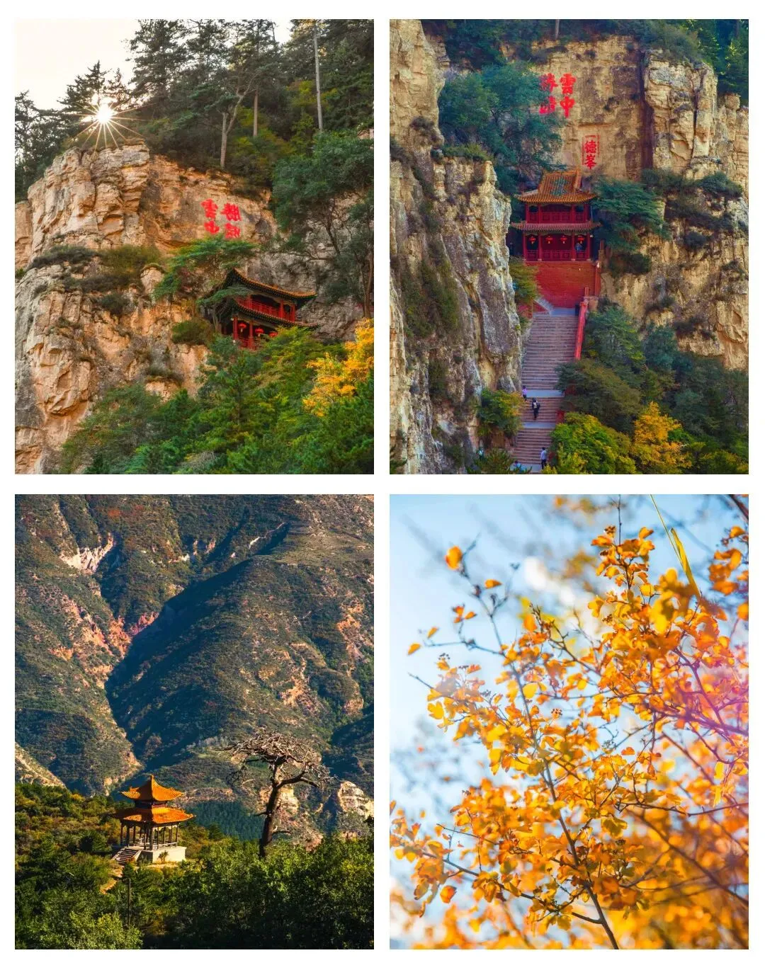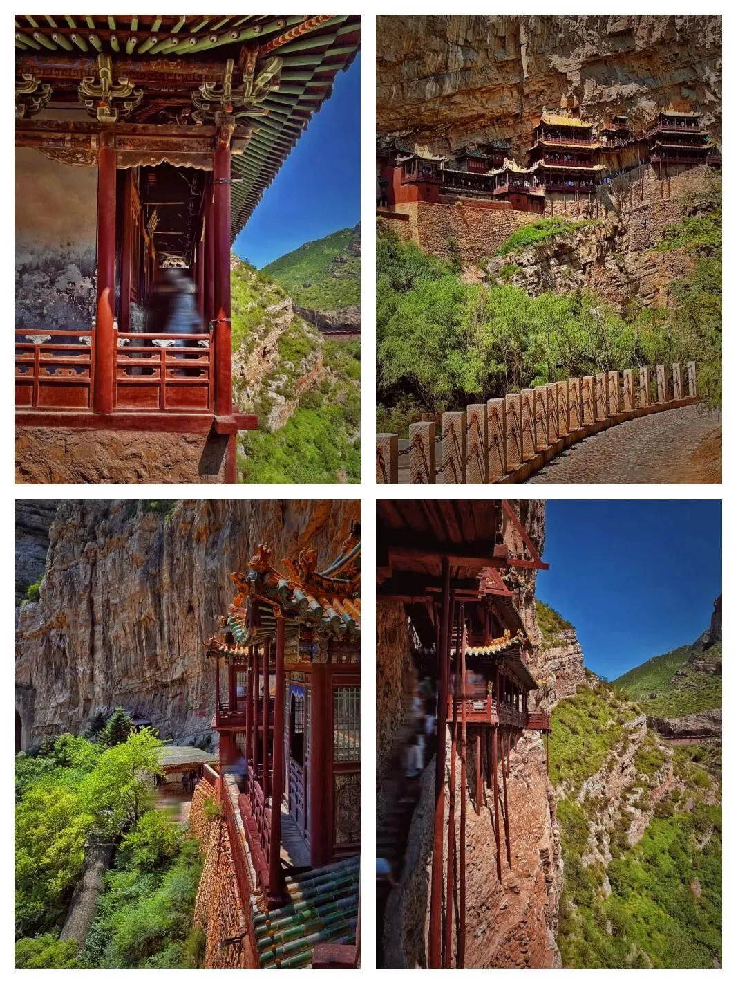 2.悬空寺:悬空寺始建于北魏太和十五年(491年),历代皆有修缮,其中金、元时期,南楼、北楼及悬空栈桥已大致形成现今的空间格局,中华民国时期的悬空寺与与如今所见基本一致,且现存建筑主要为明清时期修建。悬空寺寺门向南,以西为正,为木质框架式结构,呈南北走向多层次的横向布局,总体布局为 “一院二楼”,南端为一座悬空寺院, 北边为两座悬空飞楼。其中悬空寺院包括了大雄宝殿、太乙殿、关帝殿、钟楼、鼓楼、送子观音殿、伽蓝殿等,南楼有纯阳宫 、 三官殿和雷音殿,北楼有三教殿、四佛殿、三圣殿