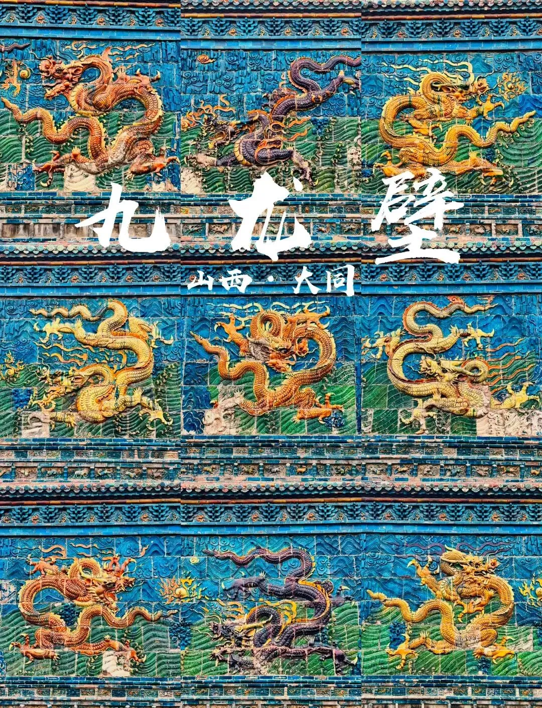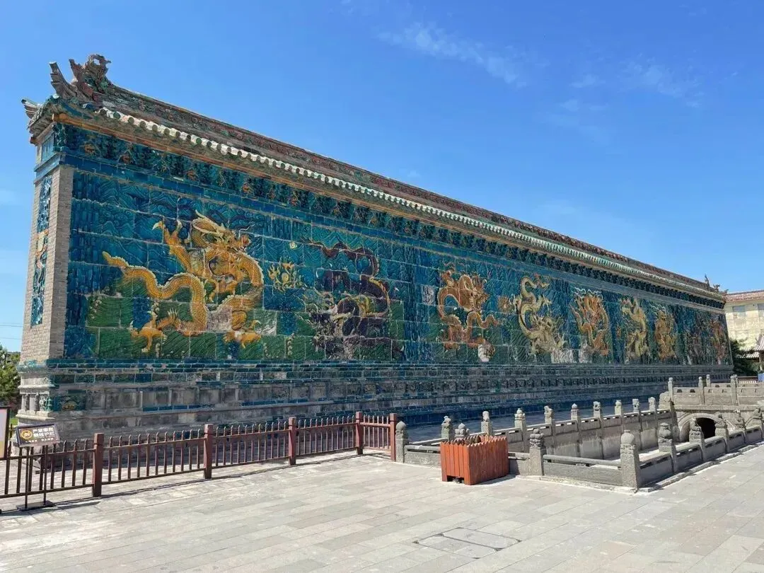 7.九龙壁:九龙壁位于大同市平城区和阳街南侧。坐南朝北,南北长38.6米,东西宽64.5米,占地面积2490平方米。据《大同县志》记载,建于明洪武二十五年(11392),为明太祖第十三子代王朱桂府邸照壁。府邸于明崇祯末年毁于兵火,唯九龙壁幸存。清代、民国曾予修缮。壁长45.5米,高8米,厚2米,下部为琉璃贴面须弥基座,束腰部分雕刻狮、象、麒麟、鹿、飞马等动物图案,壁身正面雕刻九条巨龙翻腾于云海中。全部壁面用426块黄、绿、白、赭、紫、蓝色琉璃构件拼砌而成,龙壁顶部为仿木构庑殿顶,檐上勾滴、瓦垄、脊兽、戗兽俱全,正脊上雕刻行龙、莲花等图案。