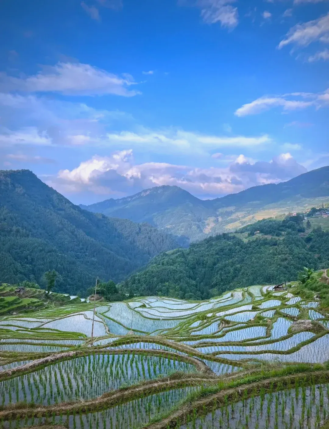 如果元阳是“教科书”,那加榜就是“诗”。从江县那边一连串山脉层叠,梯田一层又一层。晨雾升起来那一刻,像有人在田里撒水银。
